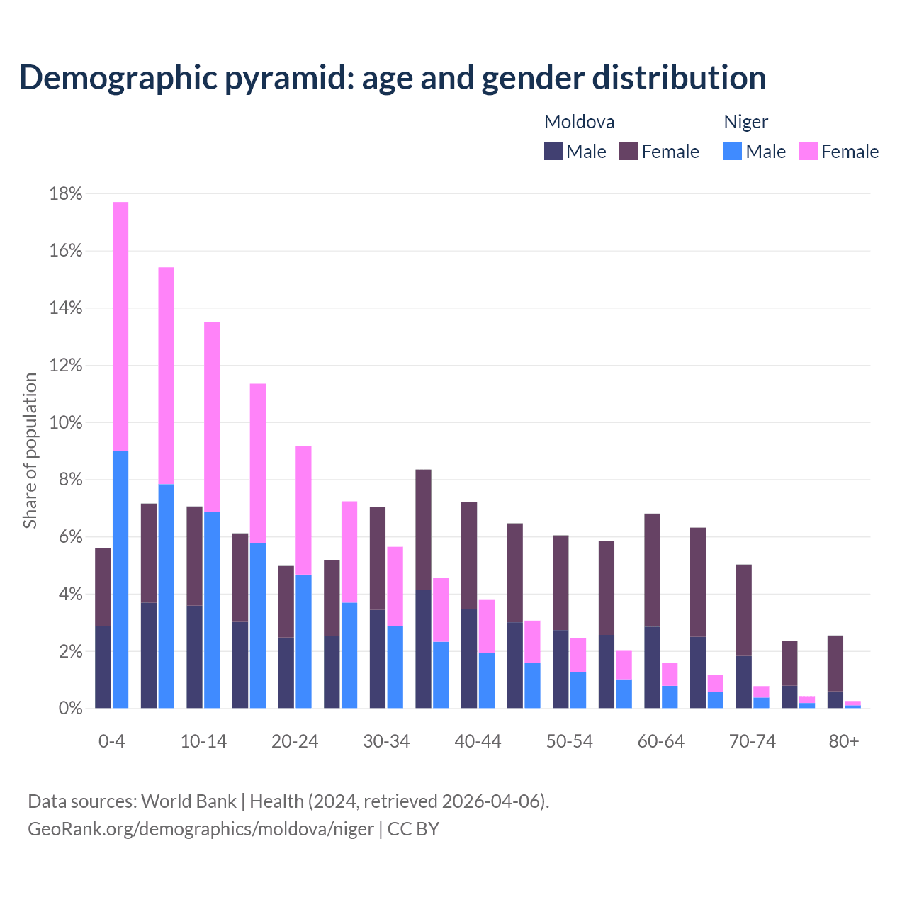 - Moldova is ranked 54/196 by median age (oldest to youngest) vs 195/196 for Niger.