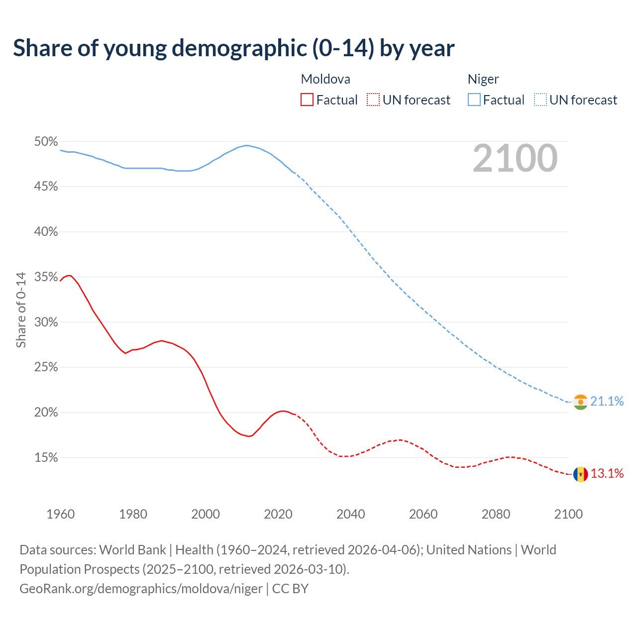 - The share of young demographic (0-15 years old) in Moldova is 19.8% vs 46.6% in Niger.