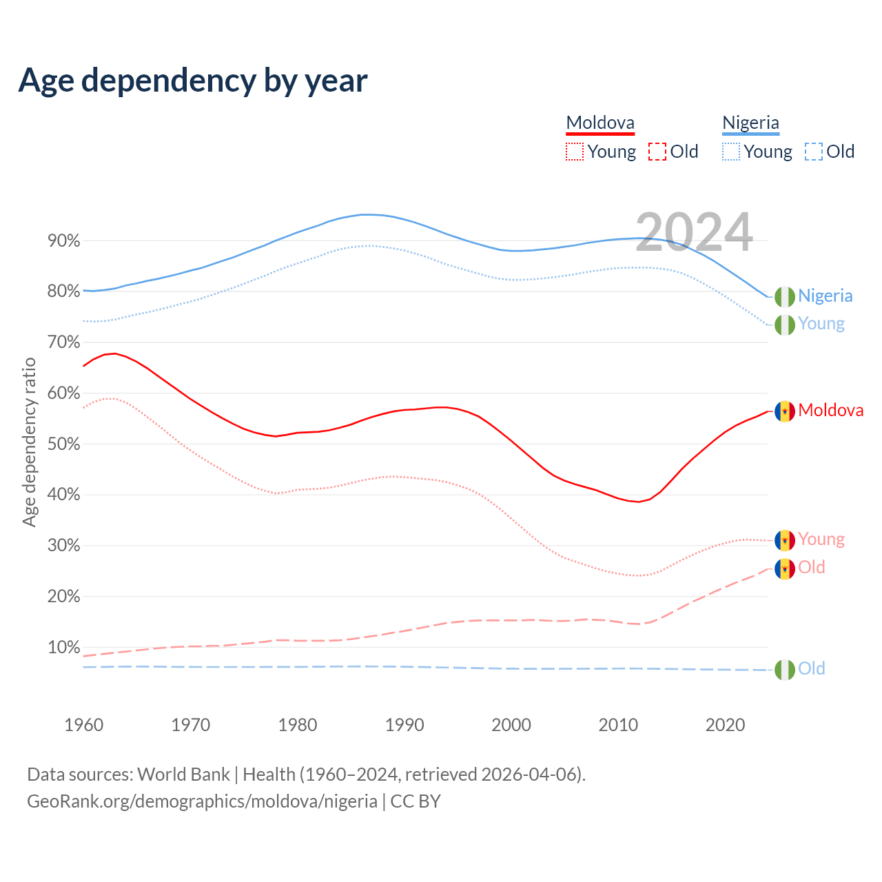 - Moldova is ranked 54/196 by median age (oldest to youngest) vs 178/196 for Nigeria.