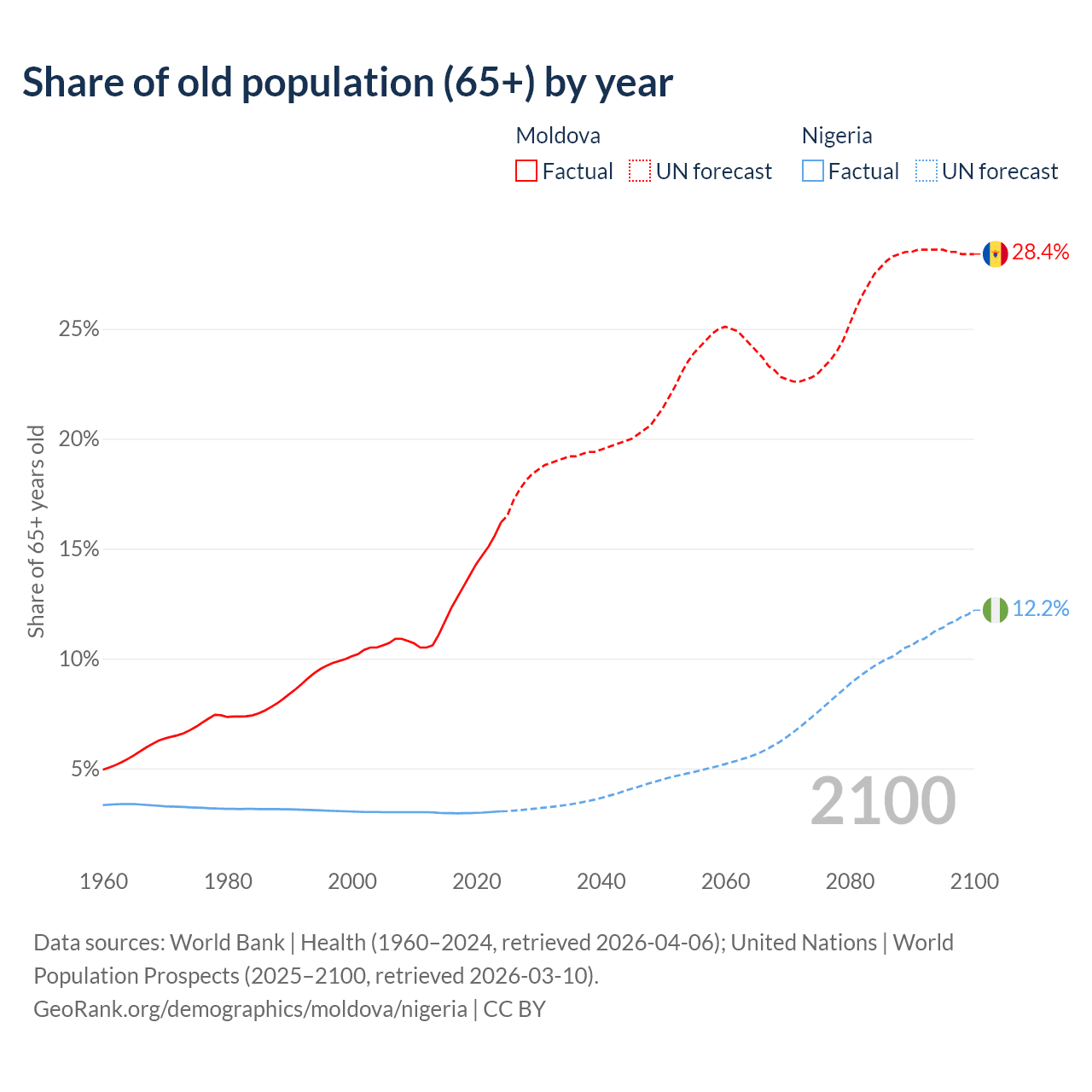 The share of older people aged 65 and over is 16.2% in Moldova and 3.05% in Nigeria. Life expectancy in Moldova compared to Nigeria .