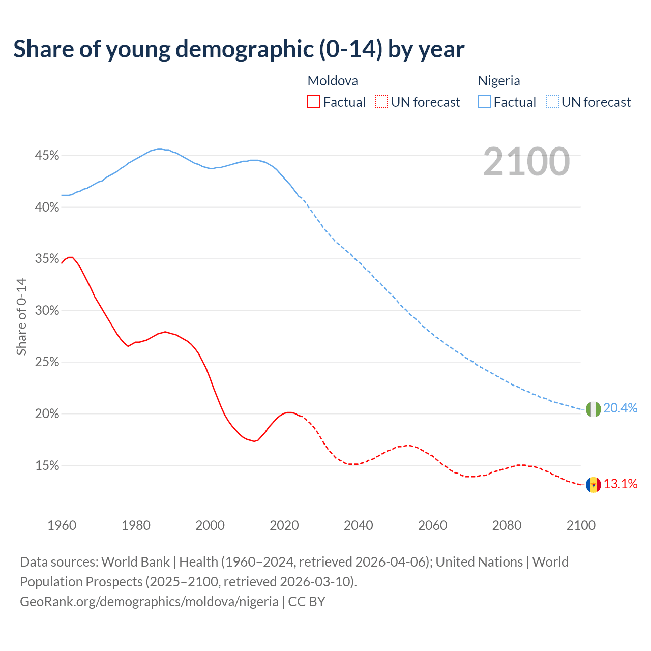 - The share of young demographic (0-15 years old) in Moldova is 19.8% vs 41% in Nigeria.