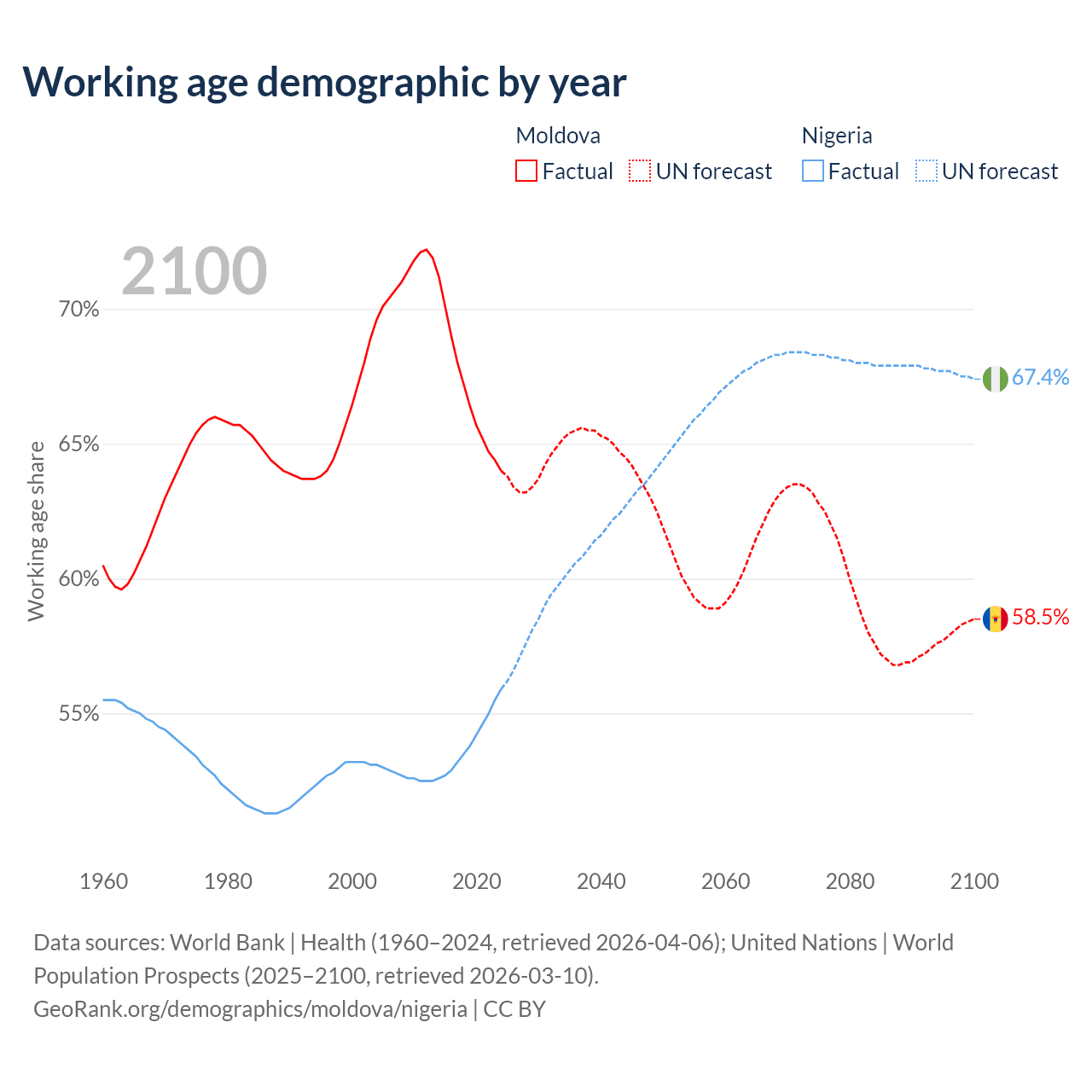 - Moldova has 1.5M working age adults (aged 15-64) vs 136M in Nigeria.