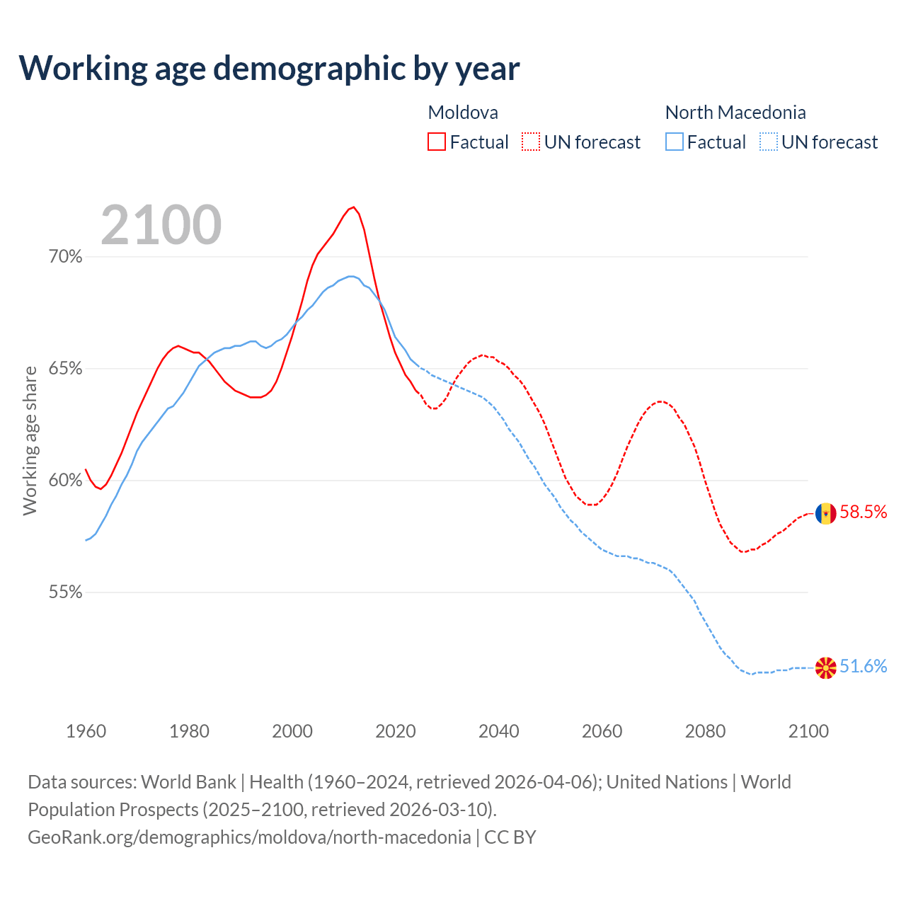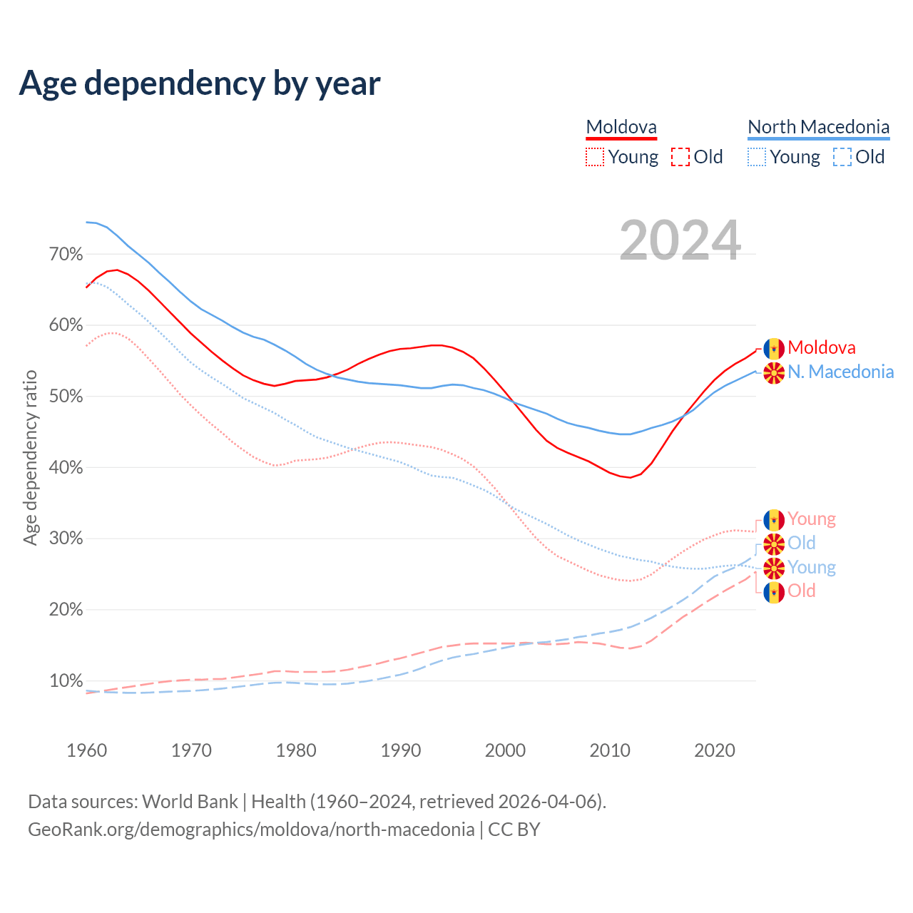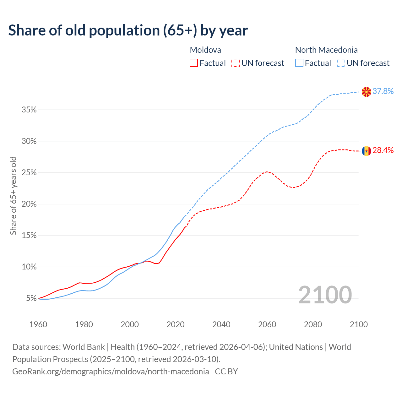 The share of older people aged 65 and over is 16.2% in Moldova and 18% in North Macedonia. Life expectancy in Moldova compared to North Macedonia .