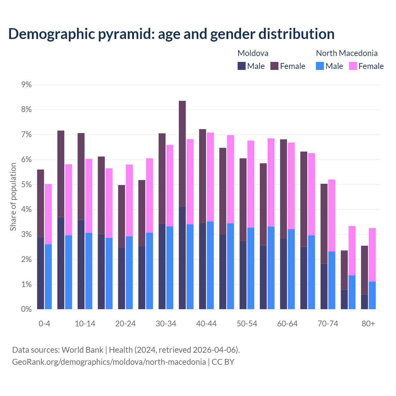 - The median age in Moldova is 39.1 years compared to 41.6 years in North Macedonia.