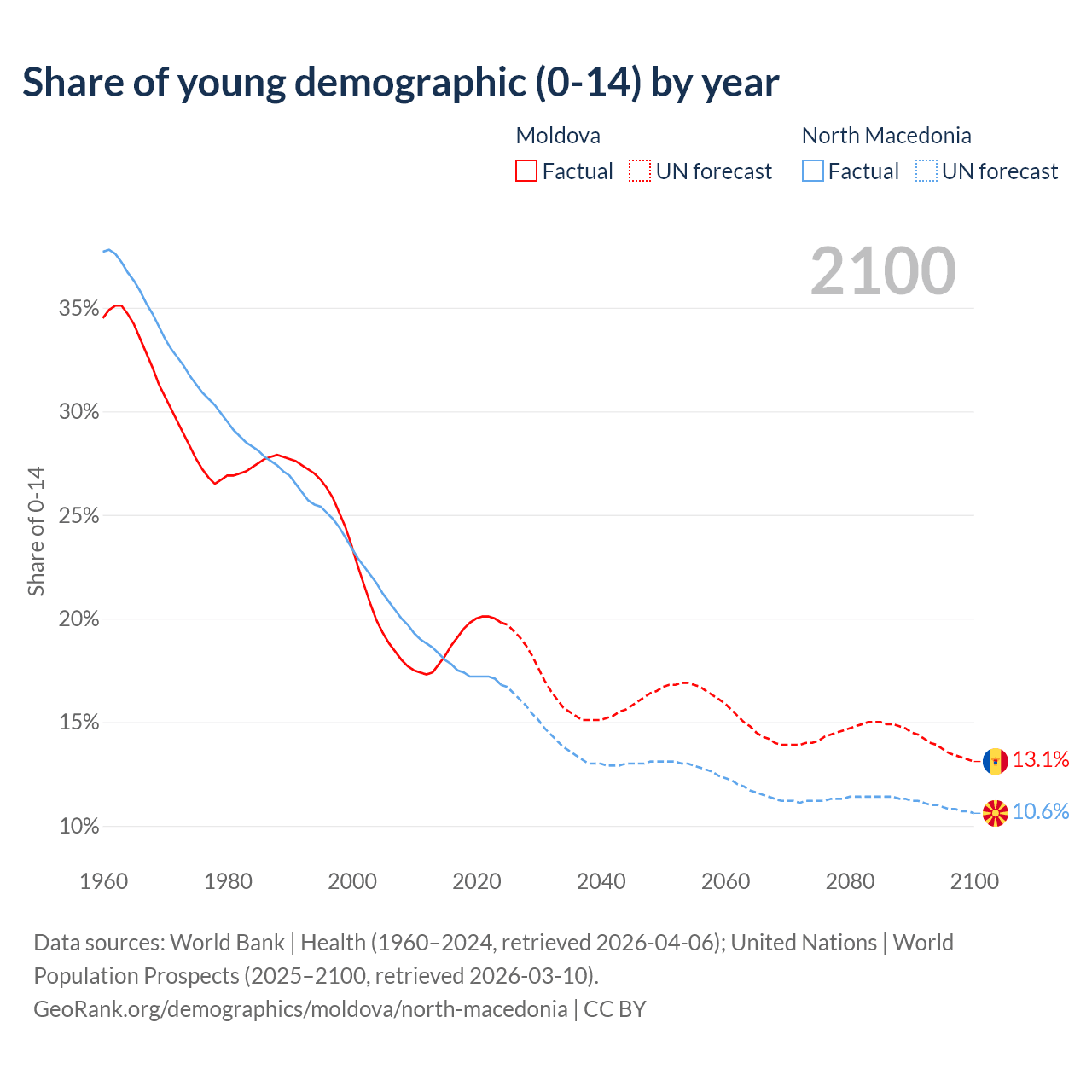 - As of 2026, the population of Moldova is 2.34M vs 1.81M in North Macedonia - 1.3 times difference.