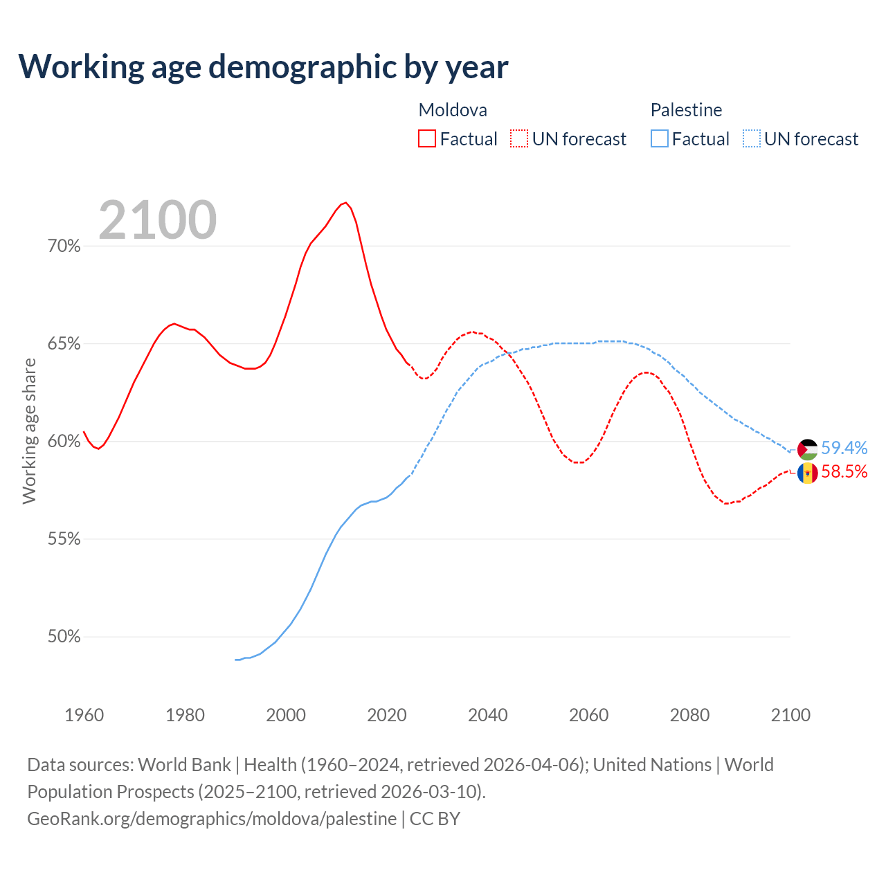 - The share of old-age demographic (65+) in Moldova is 16.2% vs 3.84% in Palestine.