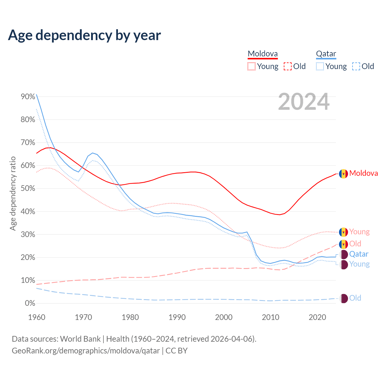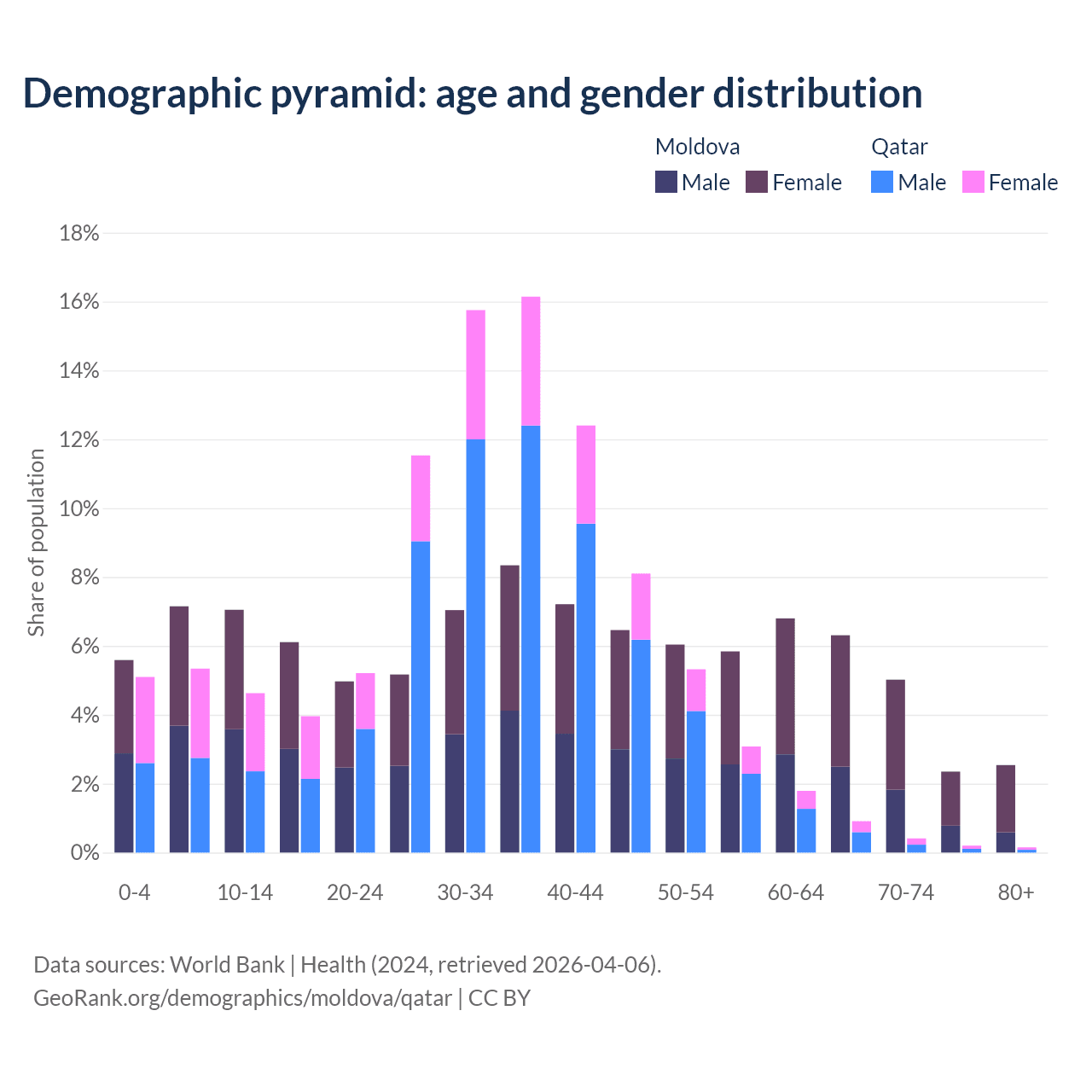 - The share of old-age demographic (65+) in Moldova is 16.2% vs 1.68% in Qatar.