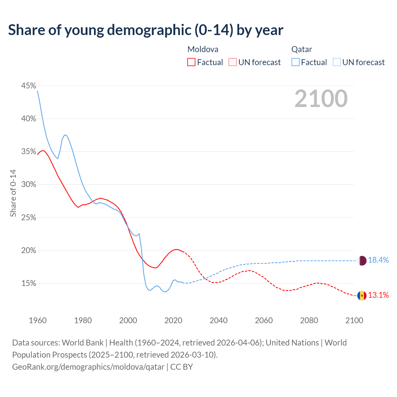 - The share of young demographic (0-15 years old) in Moldova is 19.8% vs 15.1% in Qatar.
