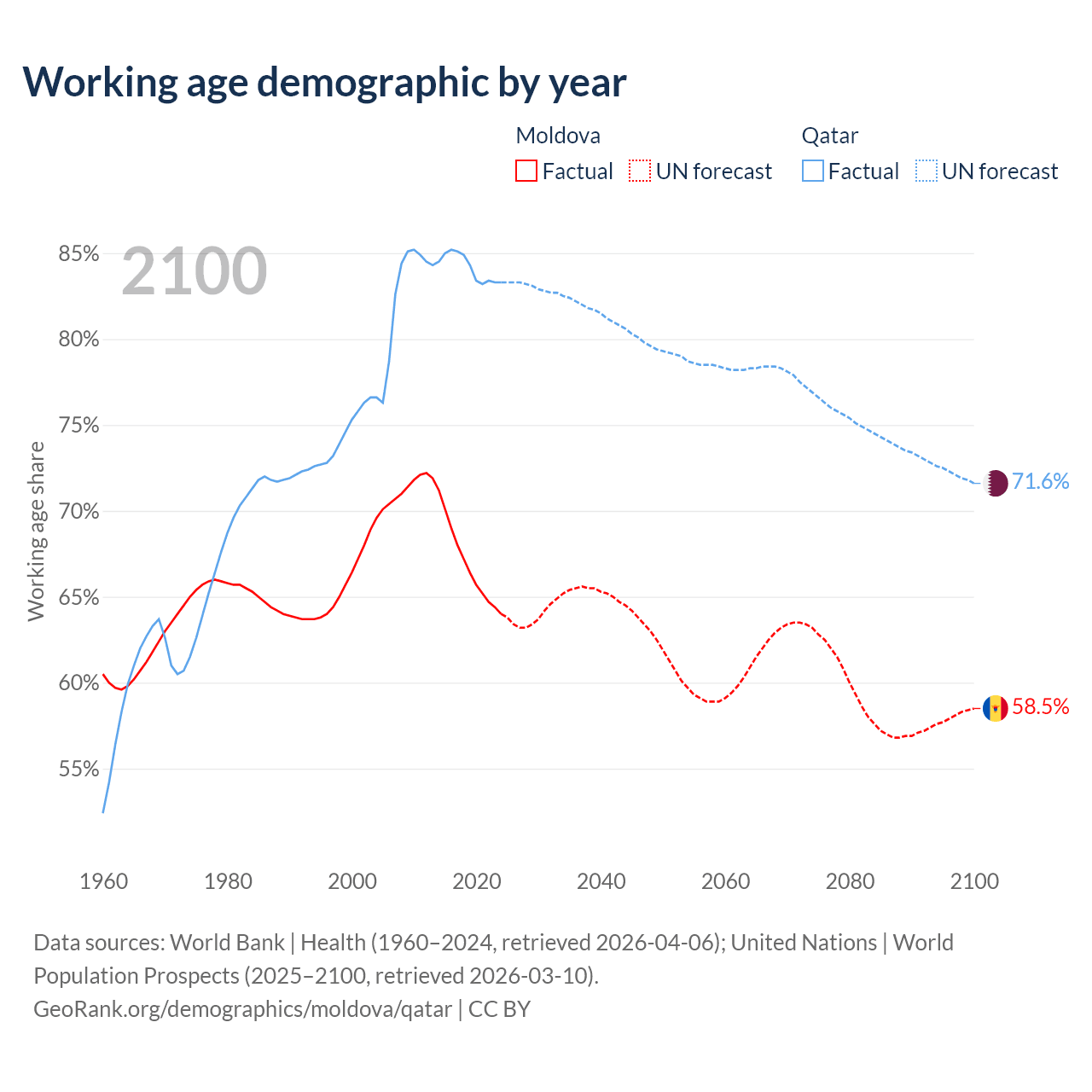 Median age Moldova vs Qatar, 1960-2100