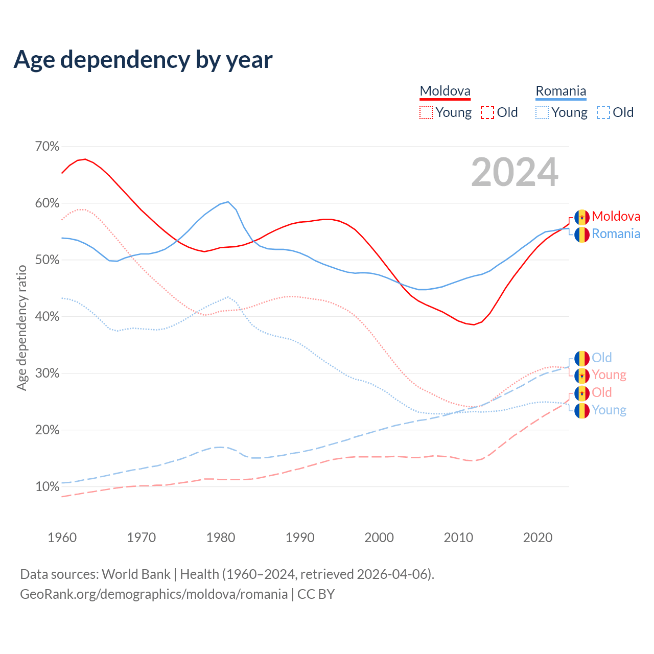 The share of older people aged 65 and over is 16.2% in Moldova and 20% in Romania. Life expectancy in Moldova compared to Romania .