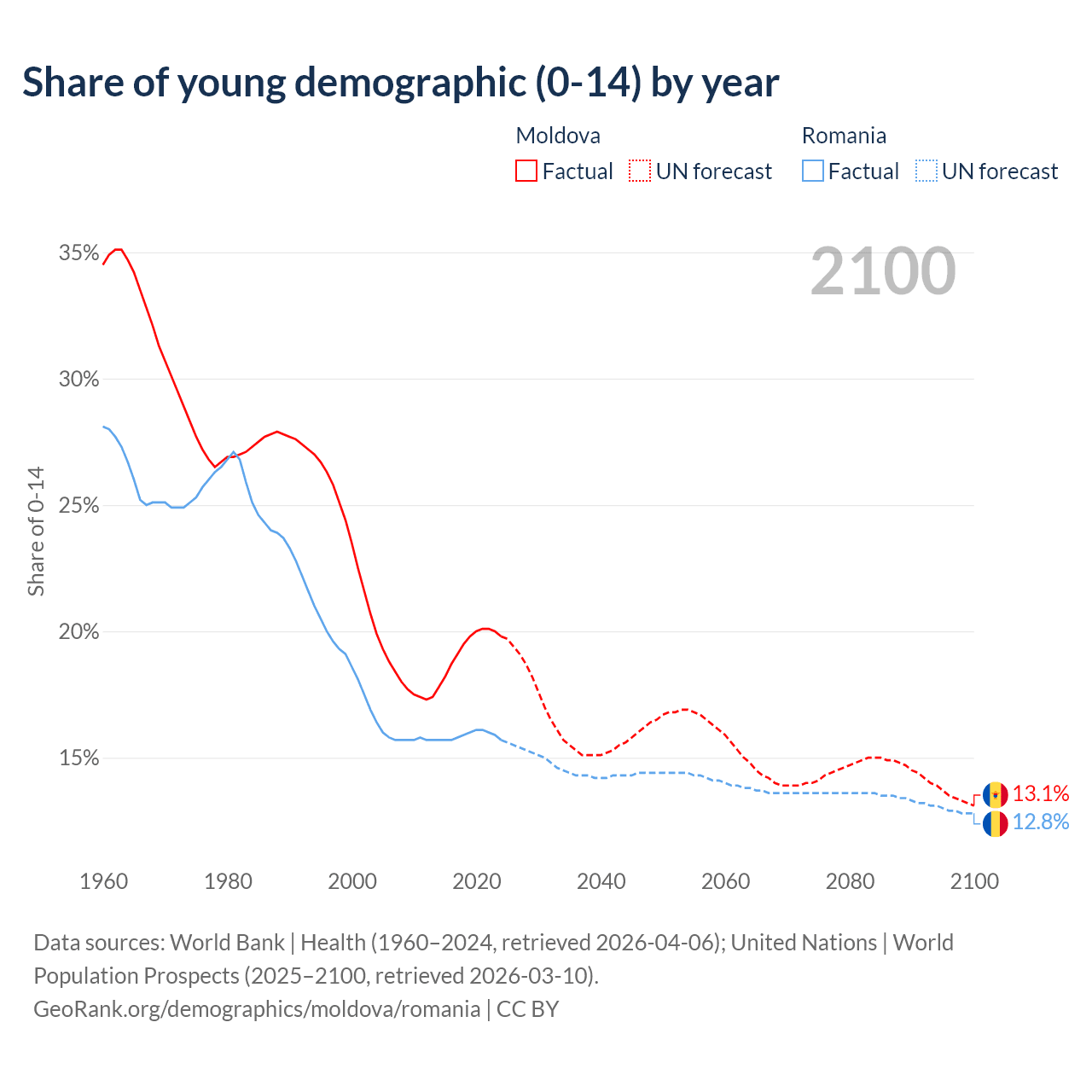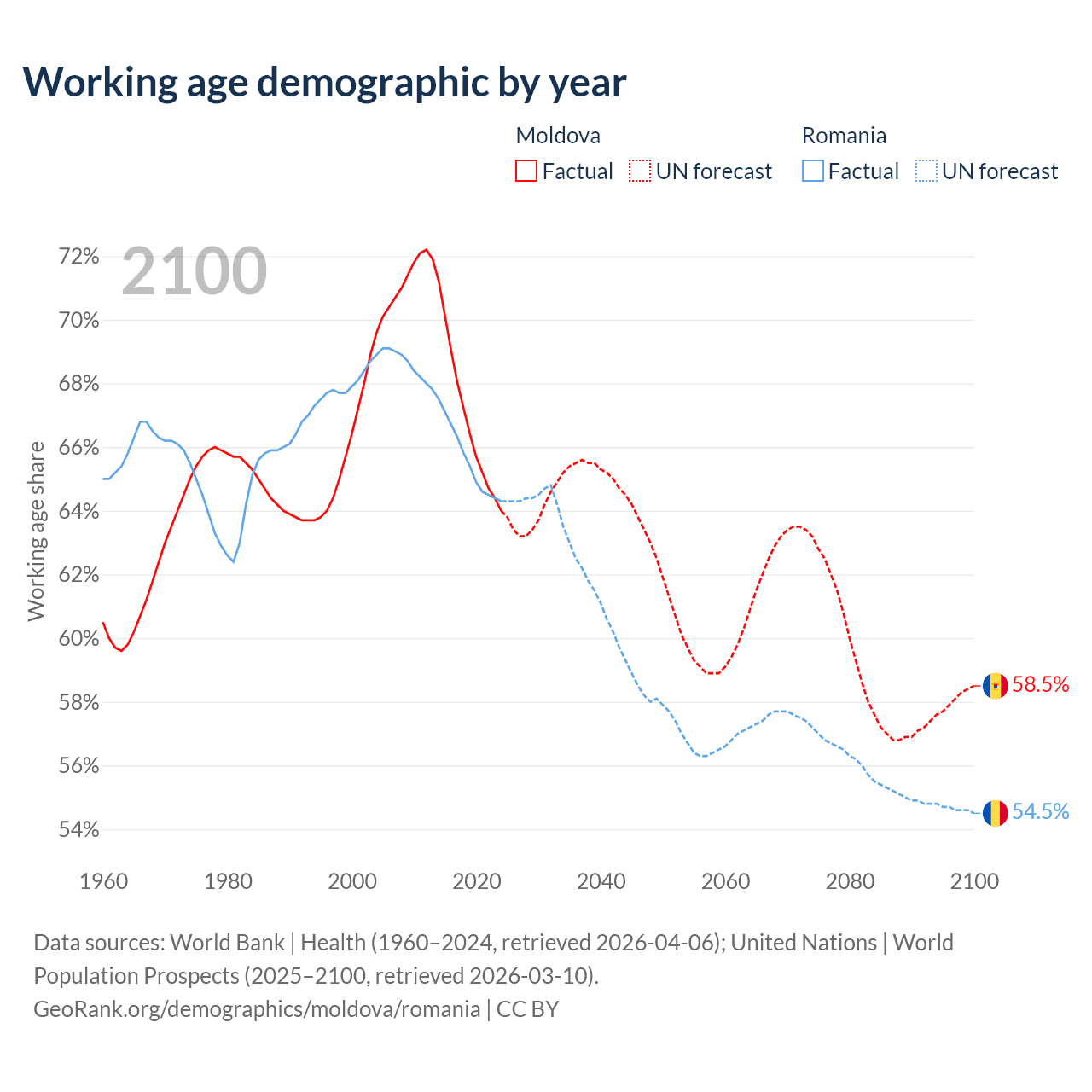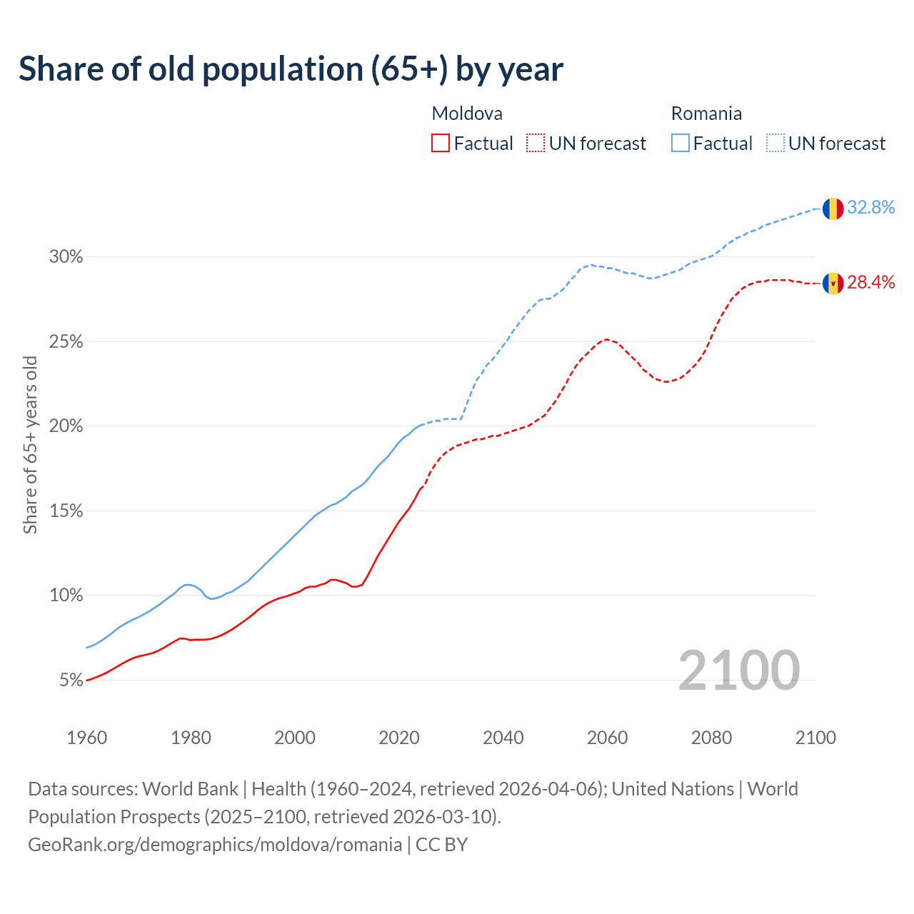 Median age Moldova vs Romania, 1960-2100
