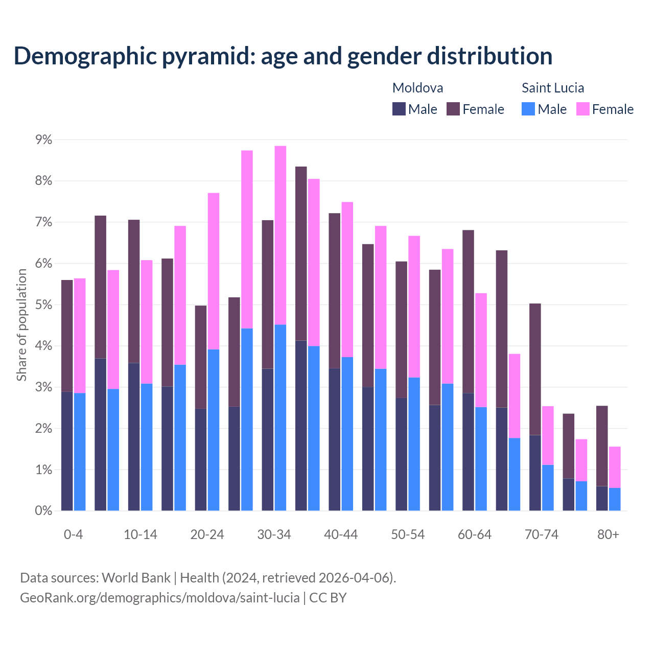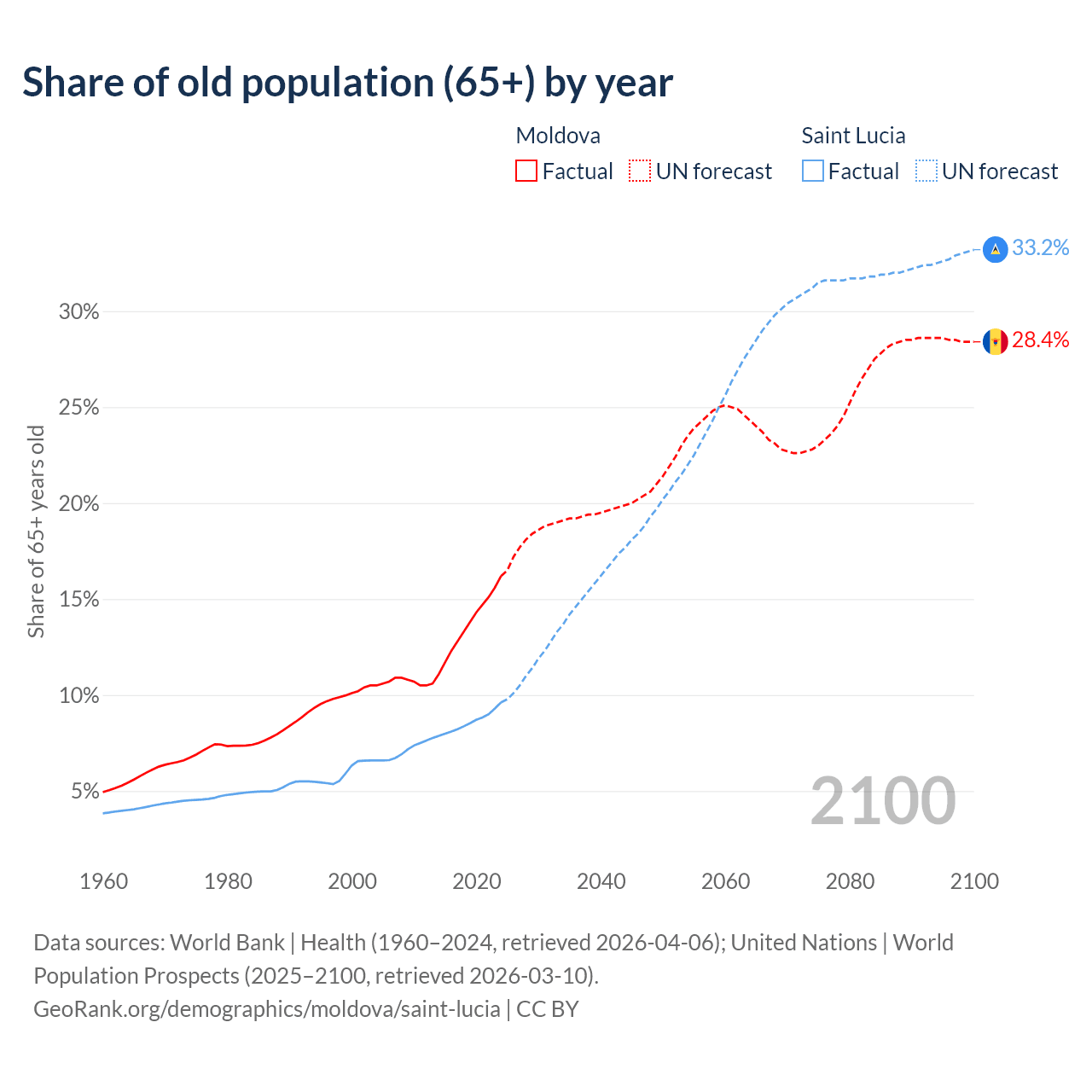 - The share of old-age demographic (65+) in Moldova is 16.2% vs 9.62% in Saint Lucia.