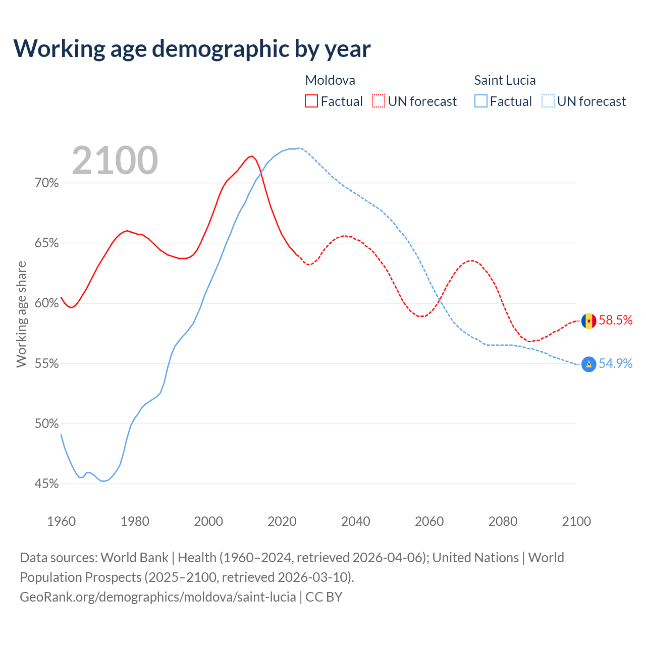 Median age Moldova vs Saint Lucia, 1960-2100