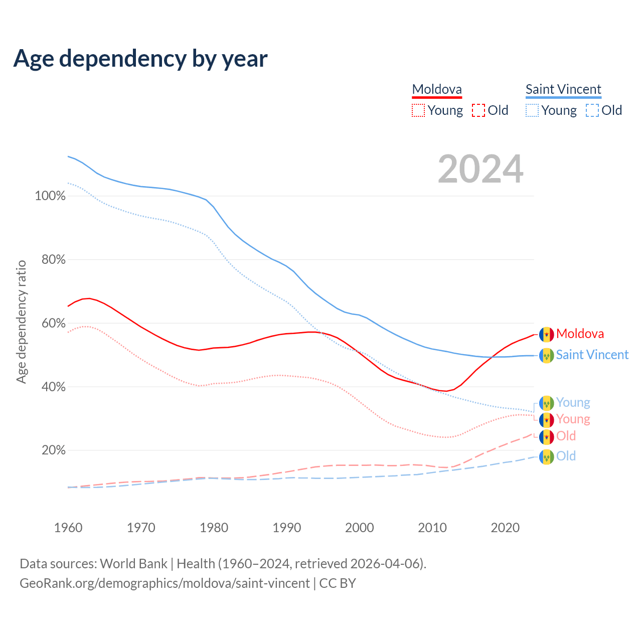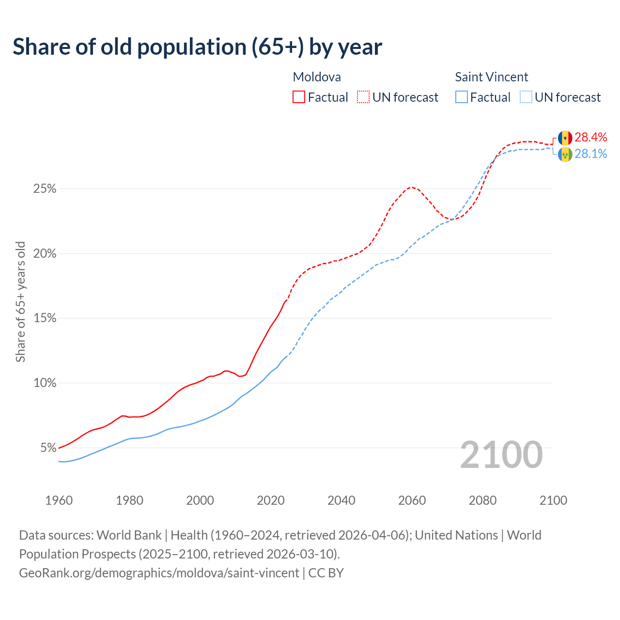 - The share of old-age demographic (65+) in Moldova is 16.2% vs 11.9% in Saint Vincent.