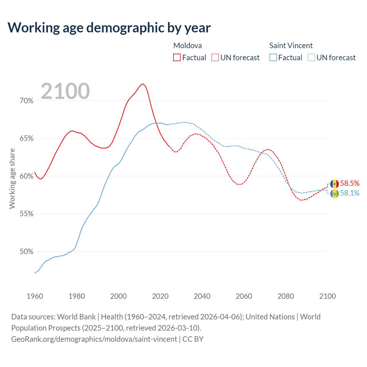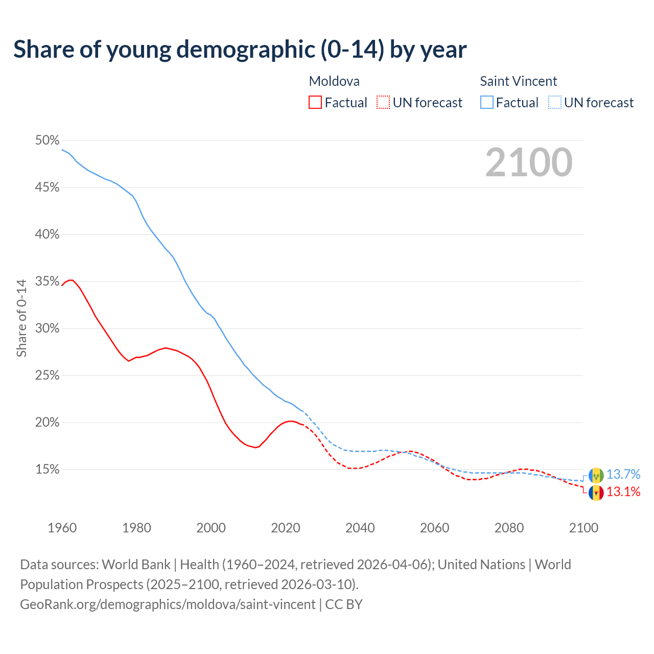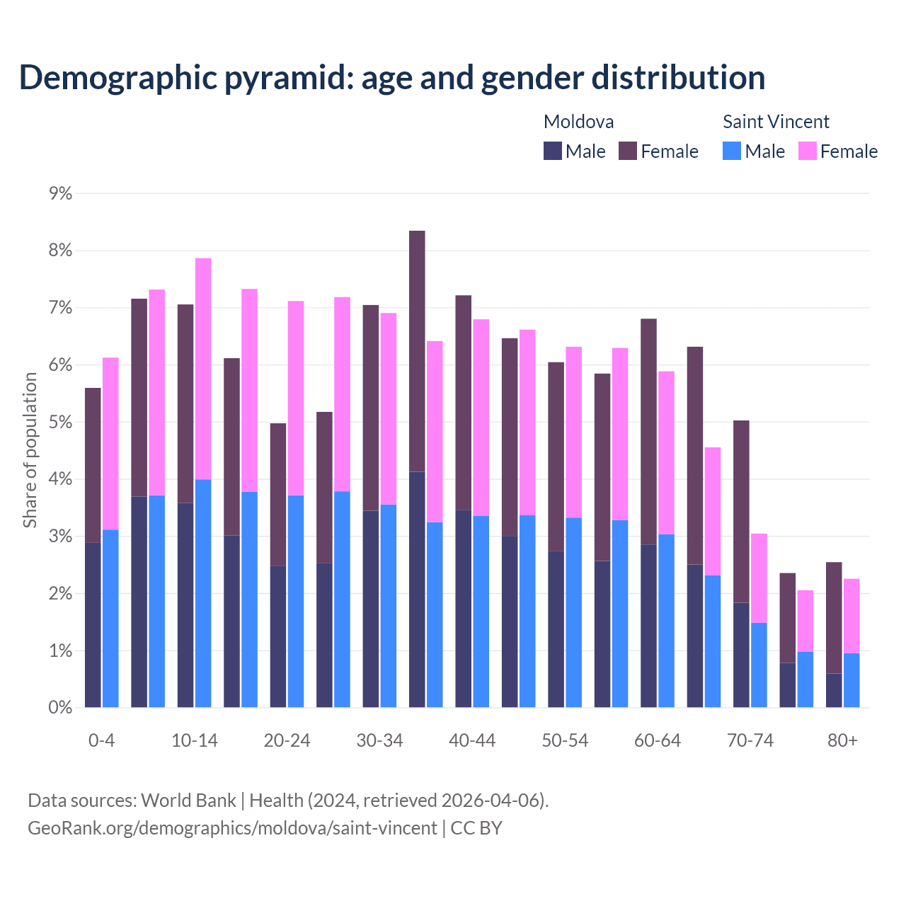 - The share of young demographic (0-15 years old) in Moldova is 19.8% vs 21.3% in Saint Vincent.
