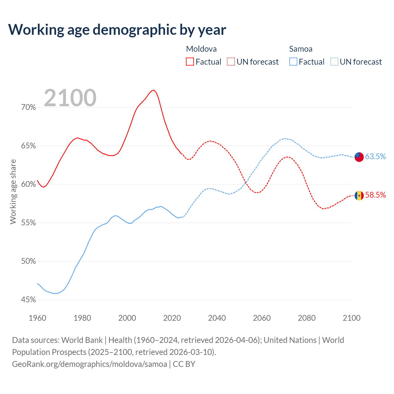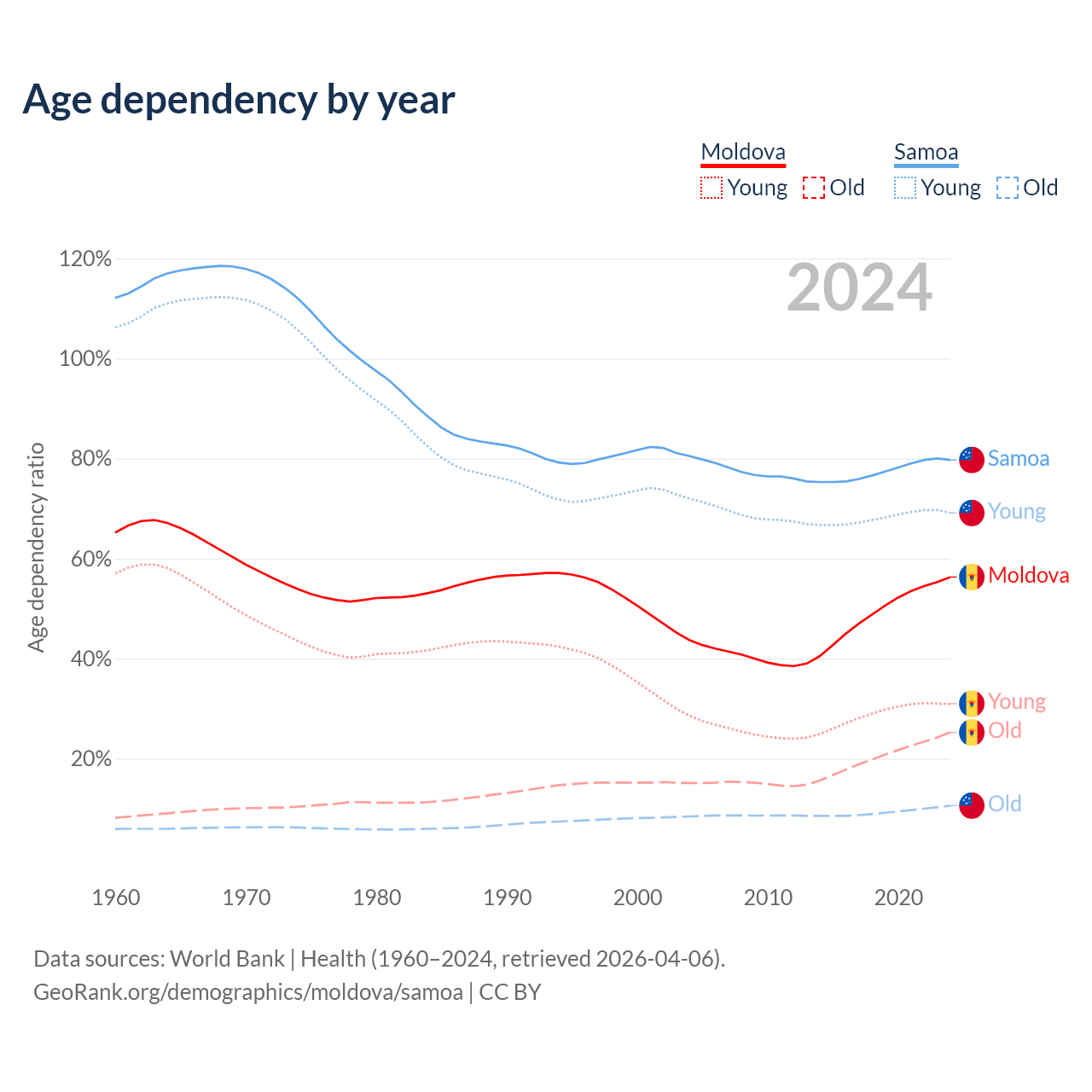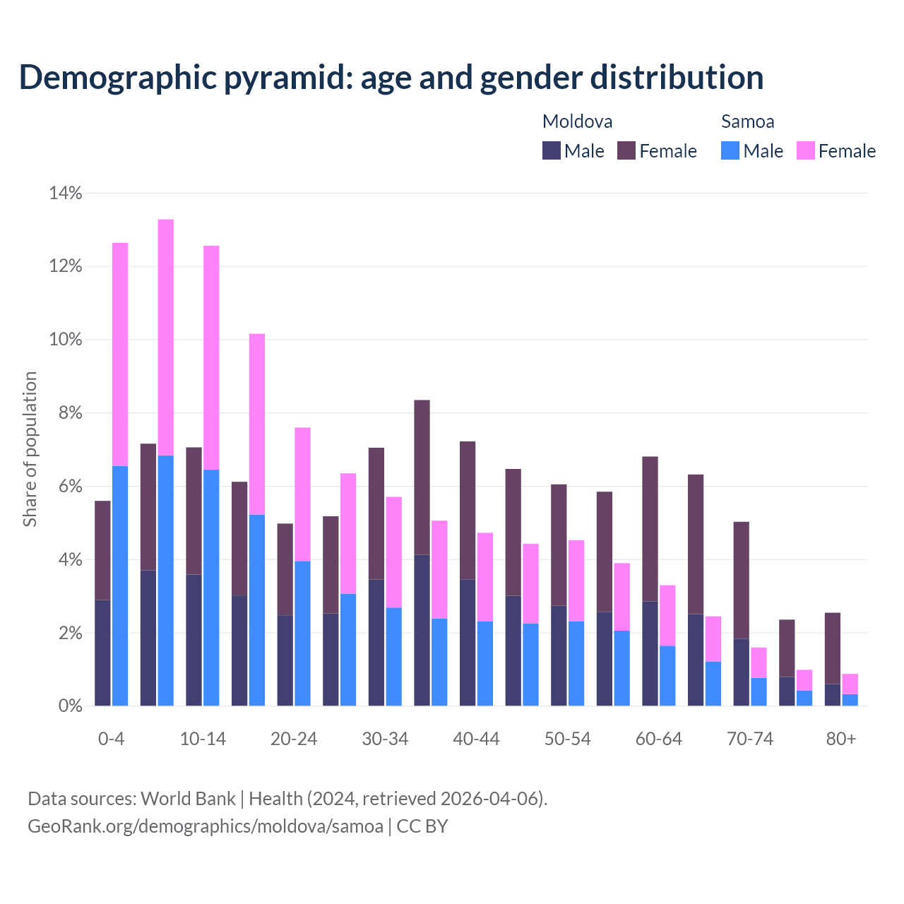 - Moldova is ranked 54/196 by median age (oldest to youngest) vs 158/196 for Samoa.