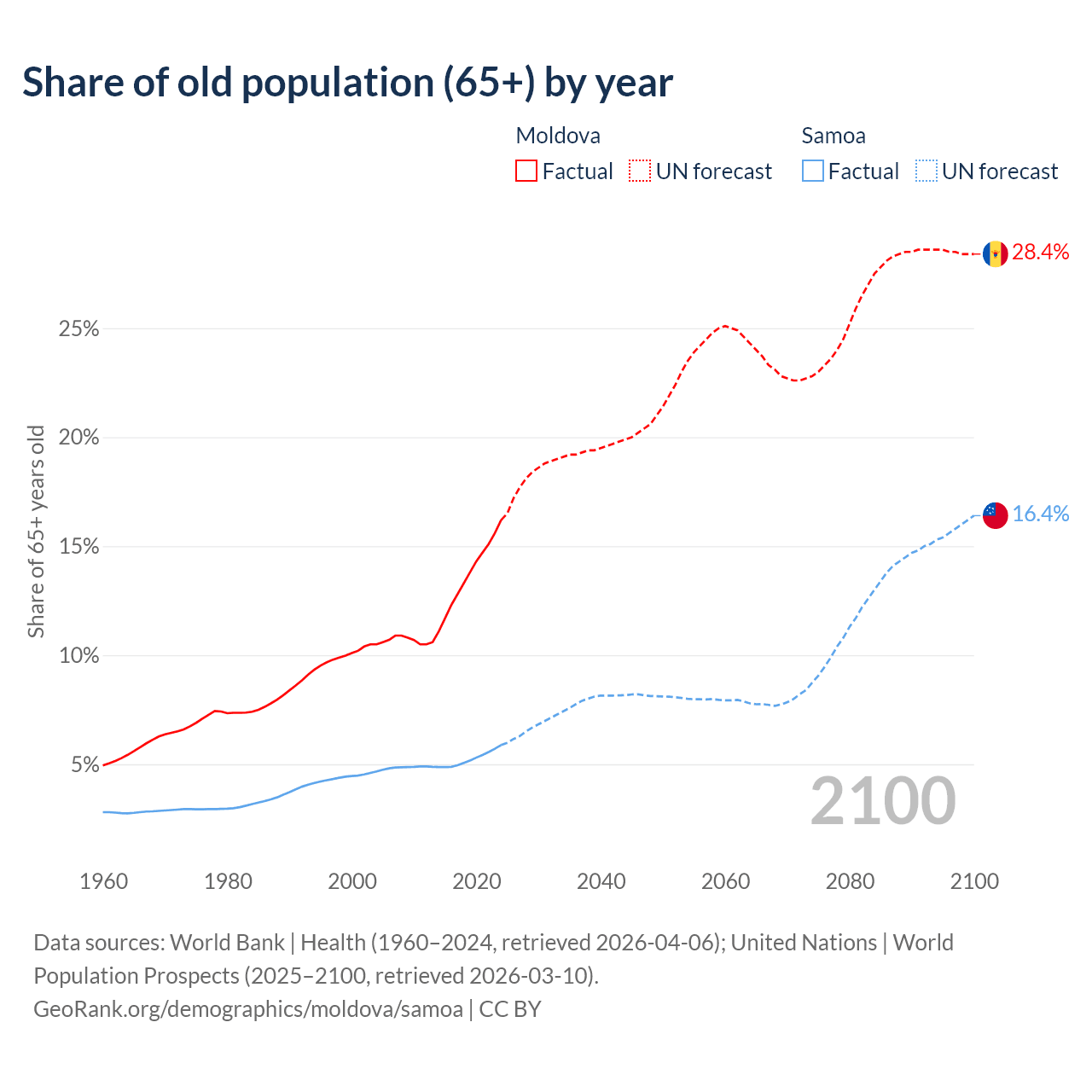 - The share of old-age demographic (65+) in Moldova is 16.2% vs 5.88% in Samoa.