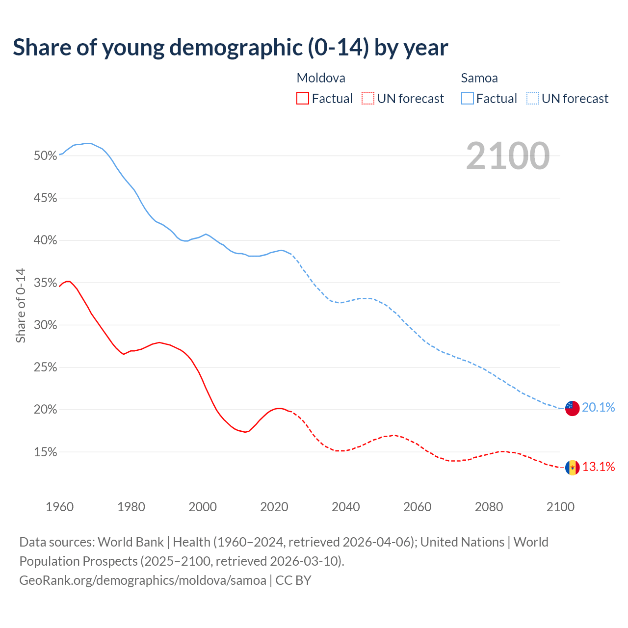 - The share of young demographic (0-15 years old) in Moldova is 19.8% vs 38.5% in Samoa.