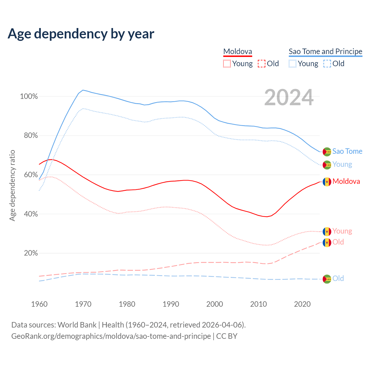 - Moldova is ranked 54/196 by median age (oldest to youngest) vs 163/196 for Sao Tome and Principe.