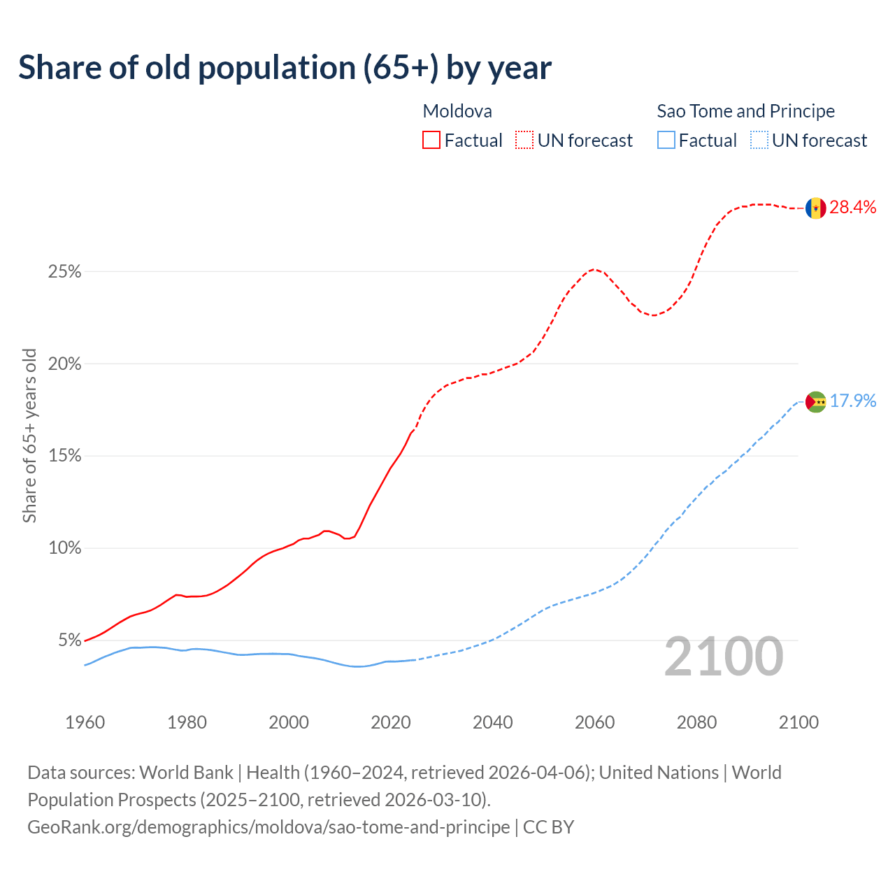 The share of older people aged 65 and over is 16.2% in Moldova and 3.9% in Sao Tome and Principe. Life expectancy in Moldova compared to Sao Tome and Principe .