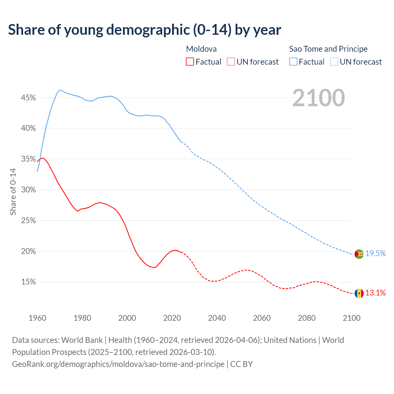 - The share of young demographic (0-15 years old) in Moldova is 19.8% vs 37.8% in Sao Tome and Principe.