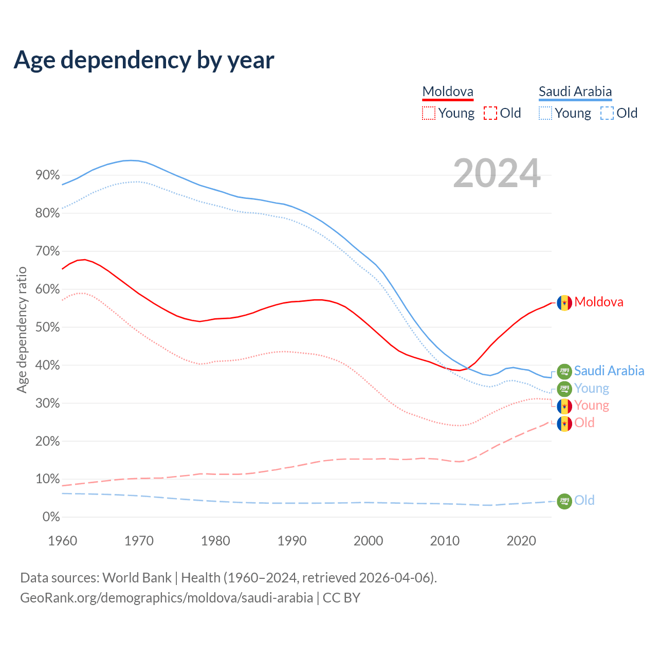 - Moldova is ranked 54/196 by median age (oldest to youngest) vs 98/196 for Saudi Arabia.