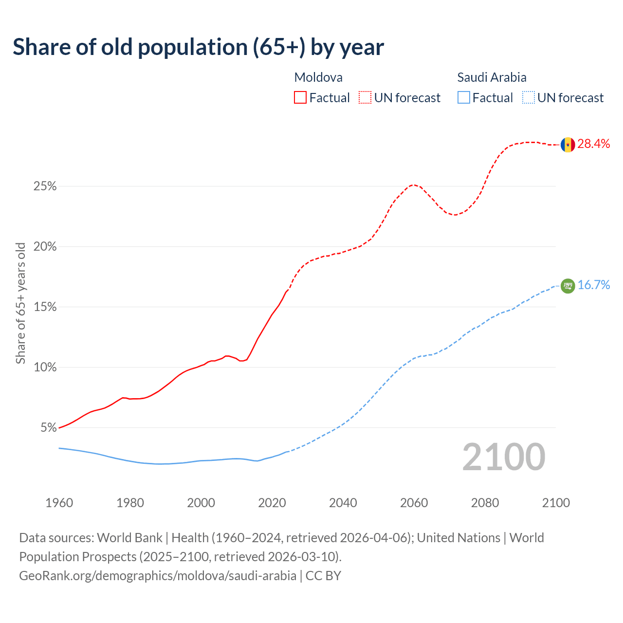 The share of older people aged 65 and over is 16.2% in Moldova and 2.95% in Saudi Arabia. Life expectancy in Moldova compared to Saudi Arabia .