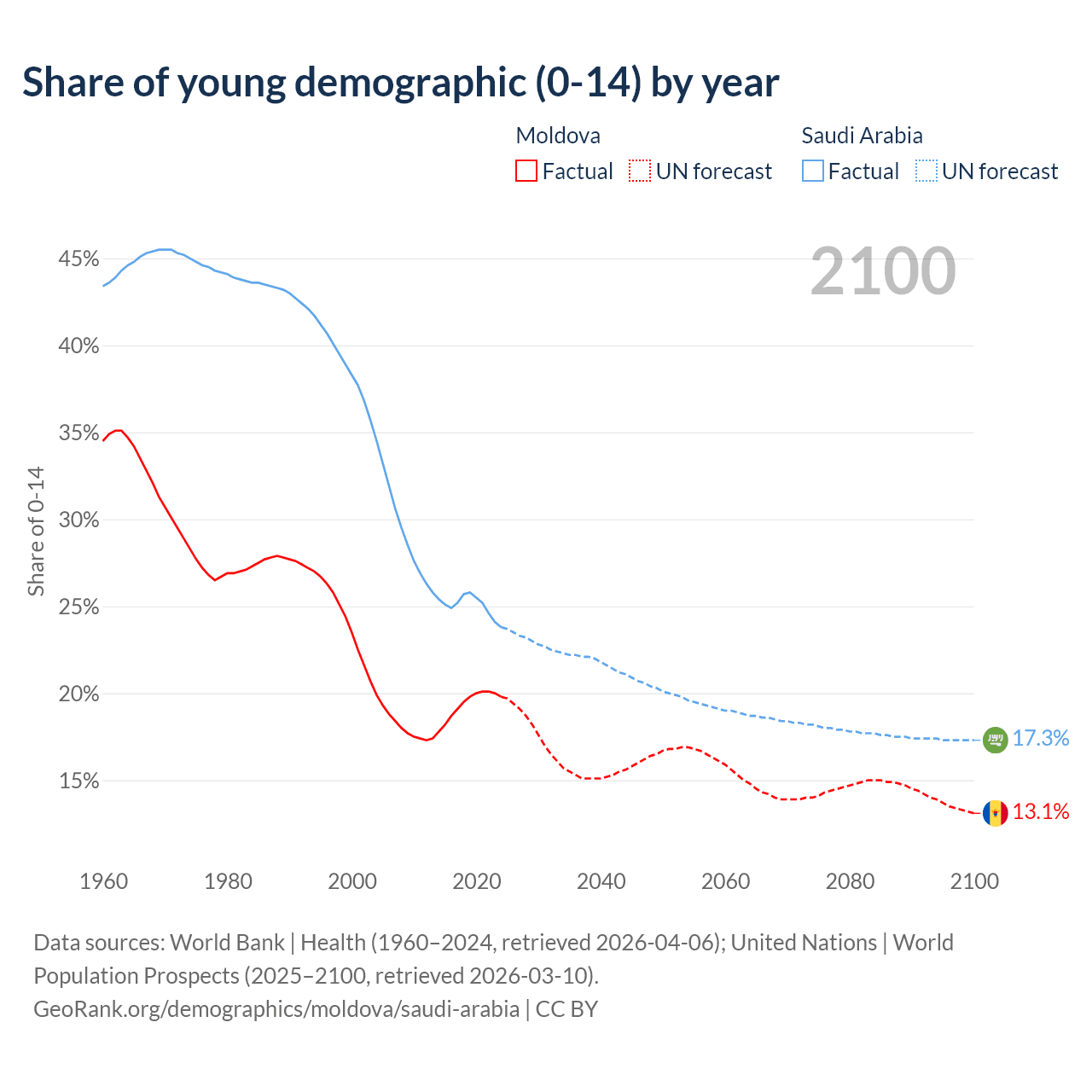 - The share of young demographic (0-15 years old) in Moldova is 19.8% vs 23.8% in Saudi Arabia.