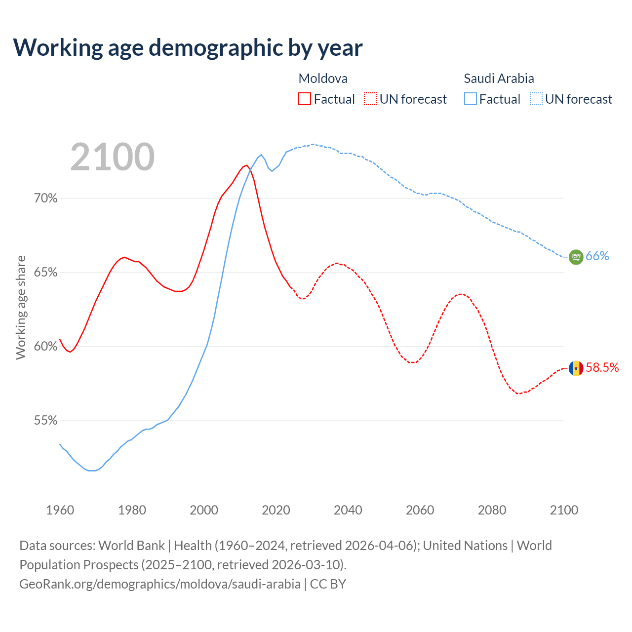 Median age Moldova vs Saudi Arabia, 1960-2100