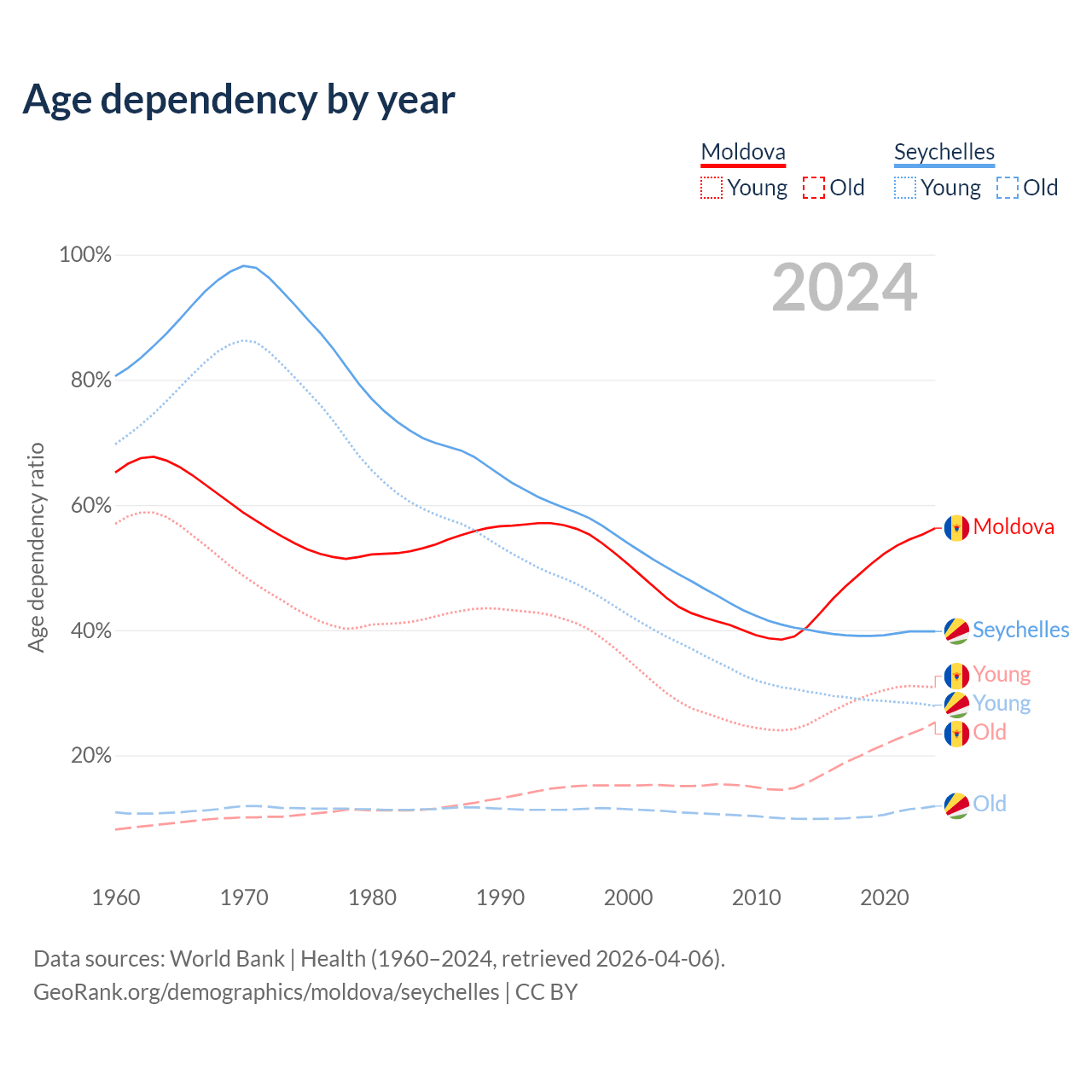 - Moldova is ranked 54/196 by median age (oldest to youngest) vs 76/196 for the Seychelles.