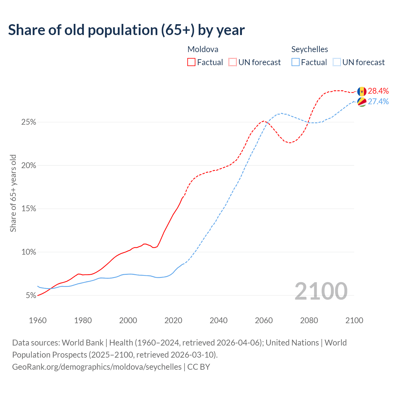The share of older people aged 65 and over is 16.2% in Moldova and 8.54% in the Seychelles. Life expectancy in Moldova compared to the Seychelles .