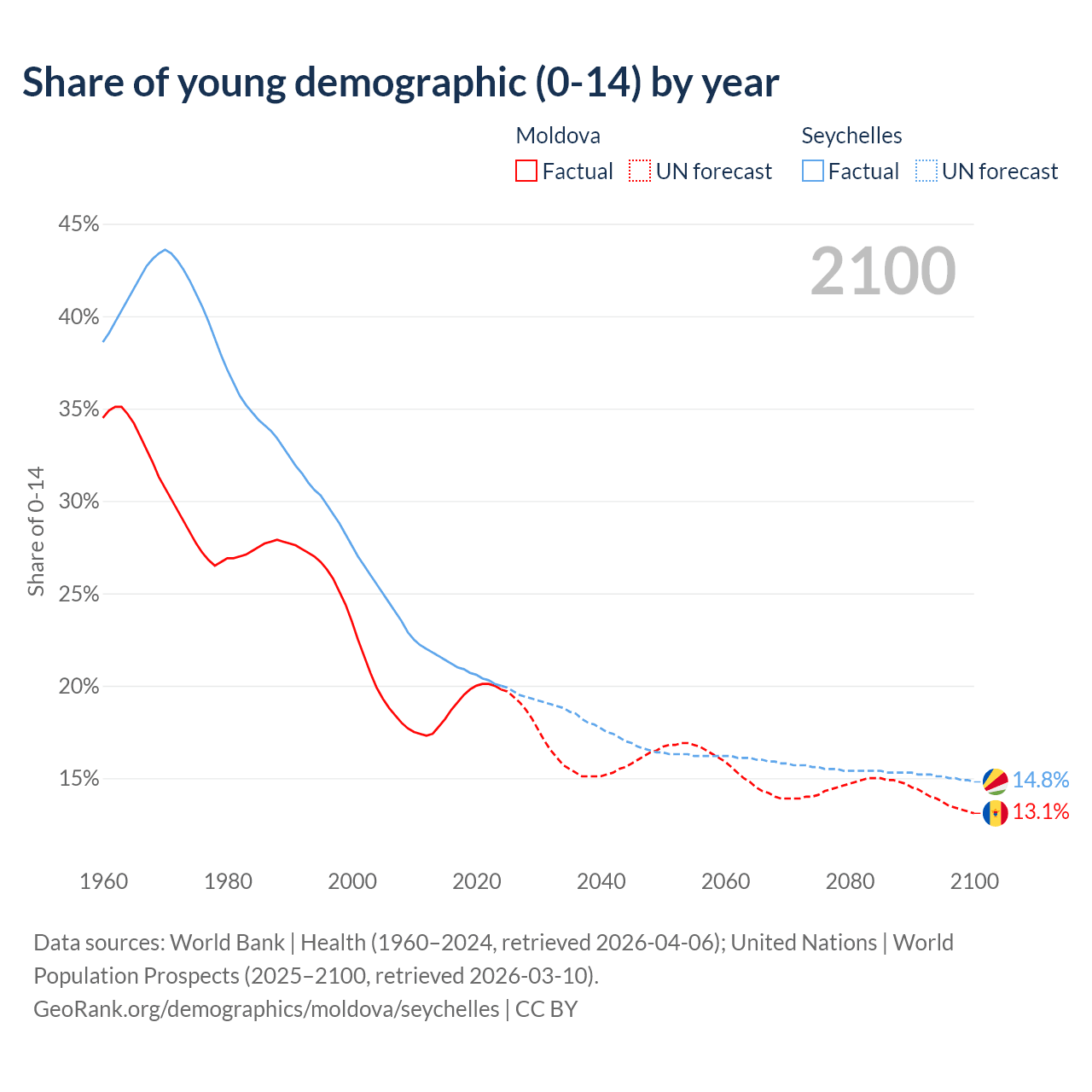 - The share of young demographic (0-15 years old) in Moldova is 19.8% vs 20% in the Seychelles.