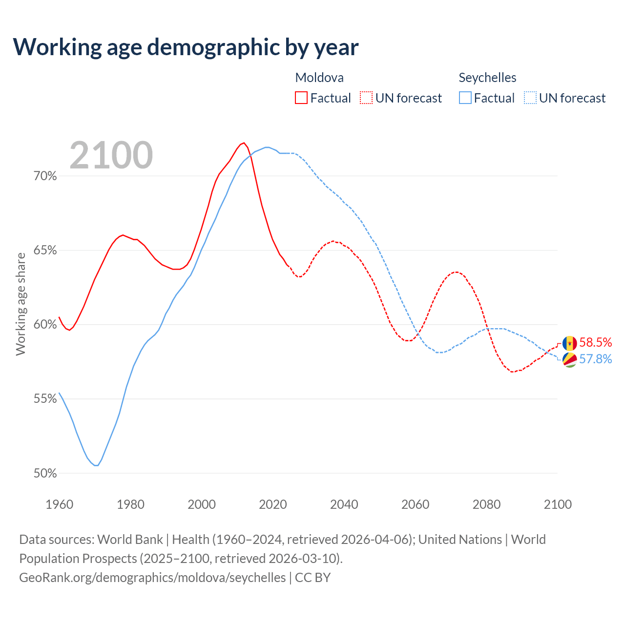 Median age Moldova vs Seychelles, 1960-2100
