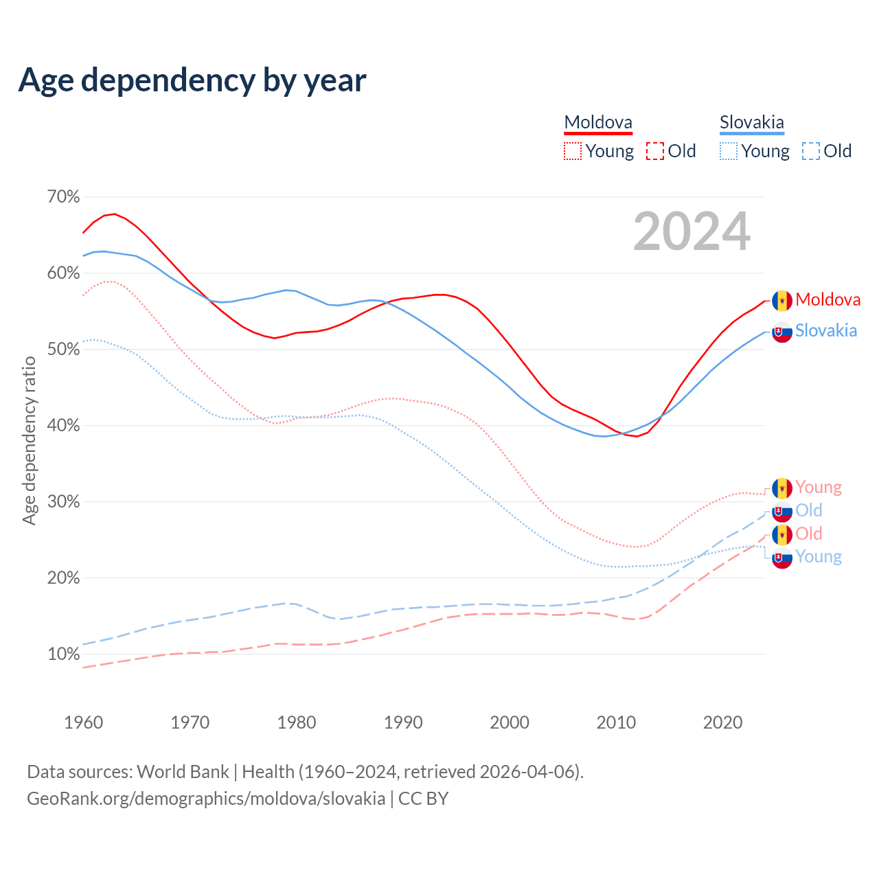 The share of older people aged 65 and over is 16.2% in Moldova and 18.5% in Slovakia. Life expectancy in Moldova compared to Slovakia .