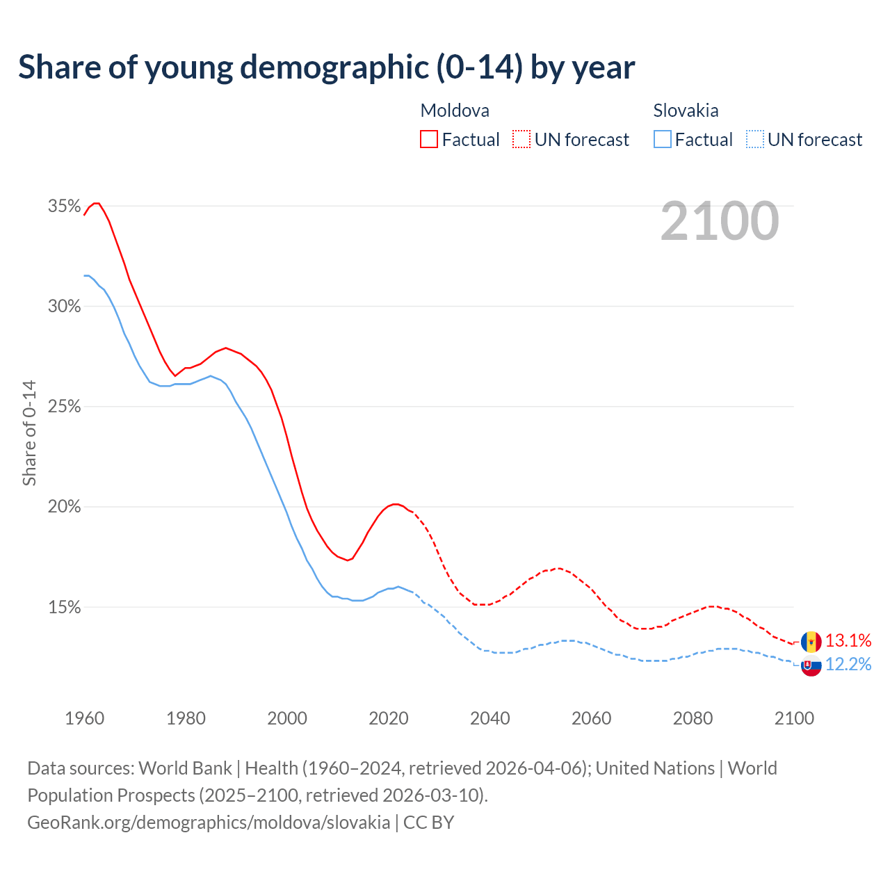 - The share of young demographic (0-15 years old) in Moldova is 19.8% vs 15.8% in Slovakia.