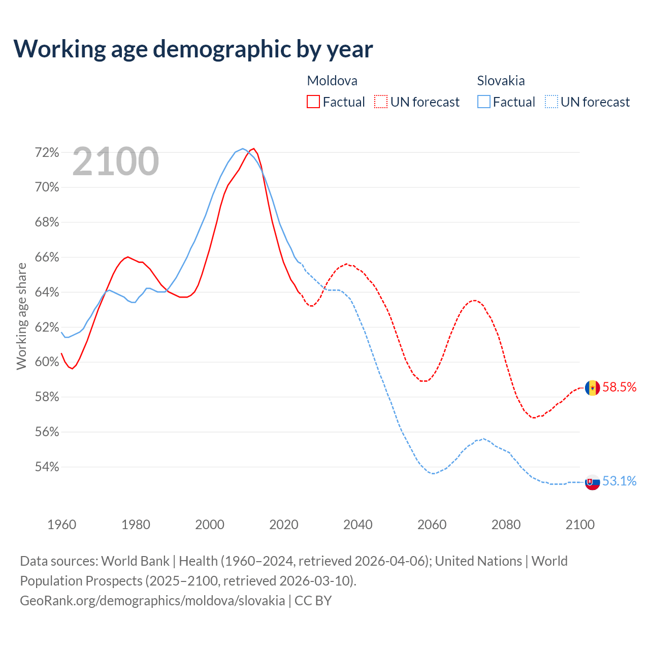 Median age Moldova vs Slovakia, 1960-2100