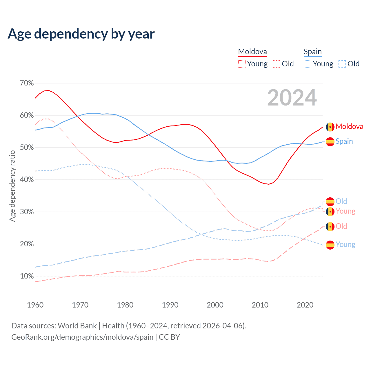 - Moldova is ranked 54/196 by median age (oldest to youngest) vs 7/196 for Spain.