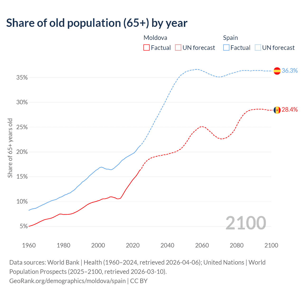 The share of older people aged 65 and over is 16.2% in Moldova and 21.1% in Spain. Life expectancy in Moldova compared to Spain .