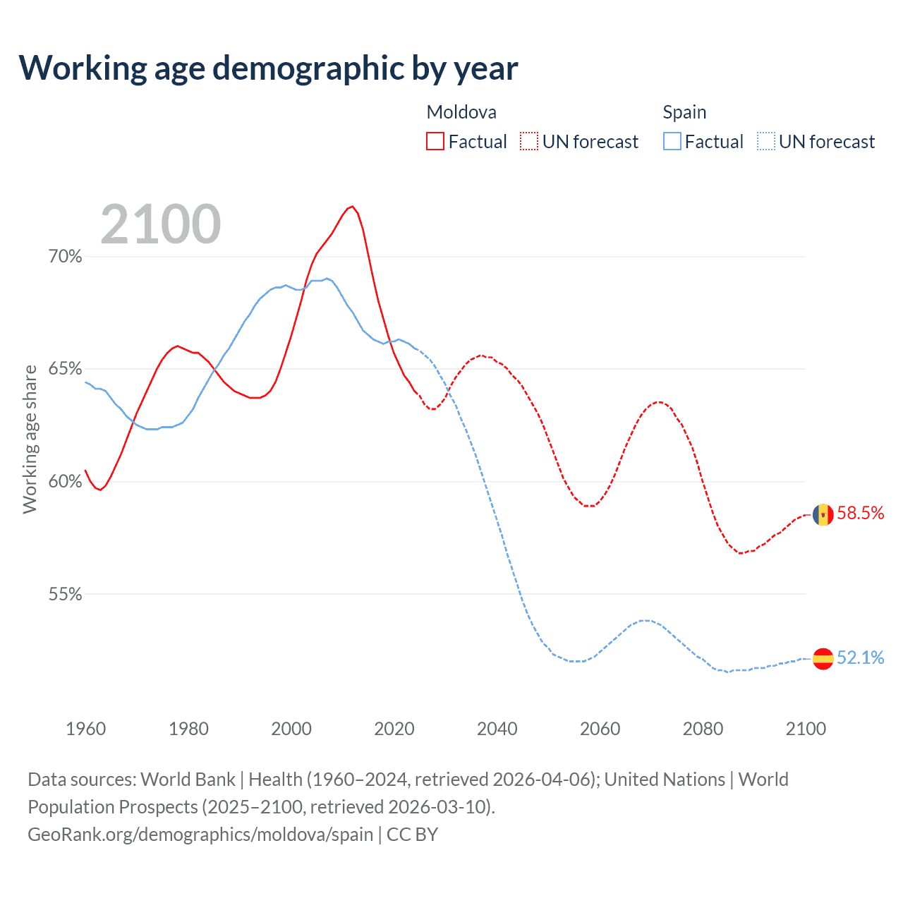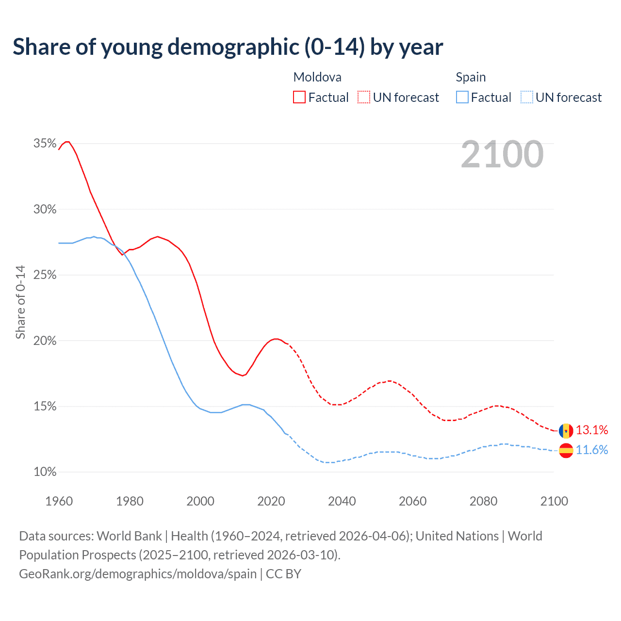 - The share of young demographic (0-15 years old) in Moldova is 19.8% vs 12.9% in Spain.