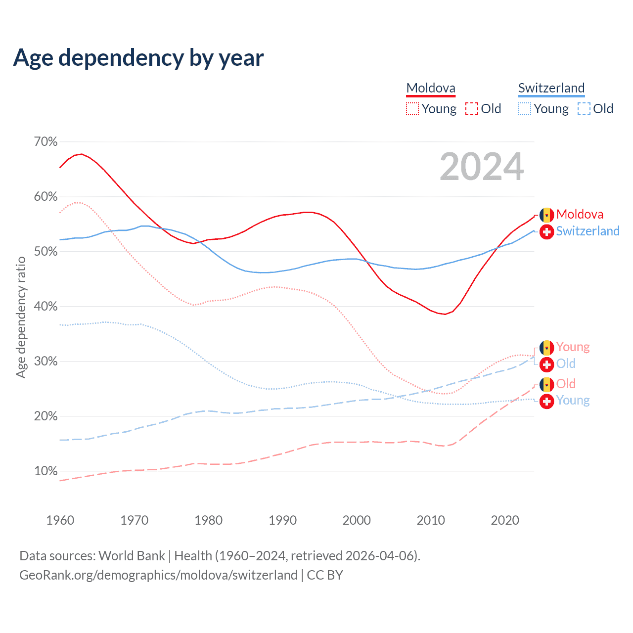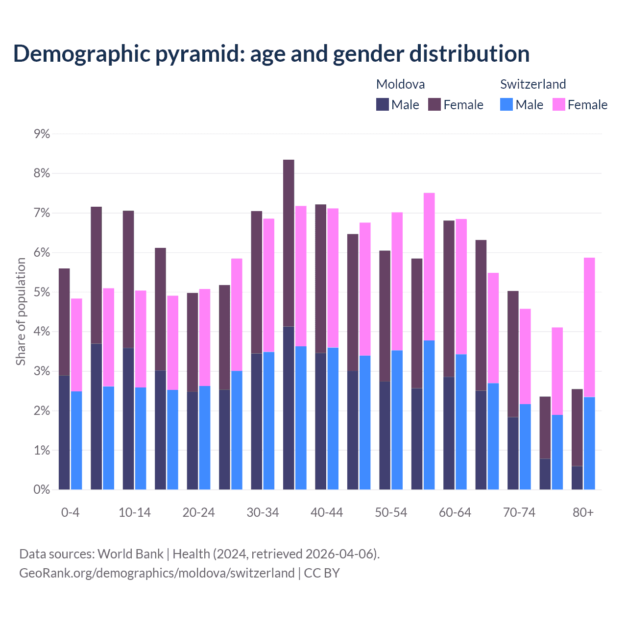- Moldova is ranked 54/196 by median age (oldest to youngest) vs 24/196 for Switzerland.