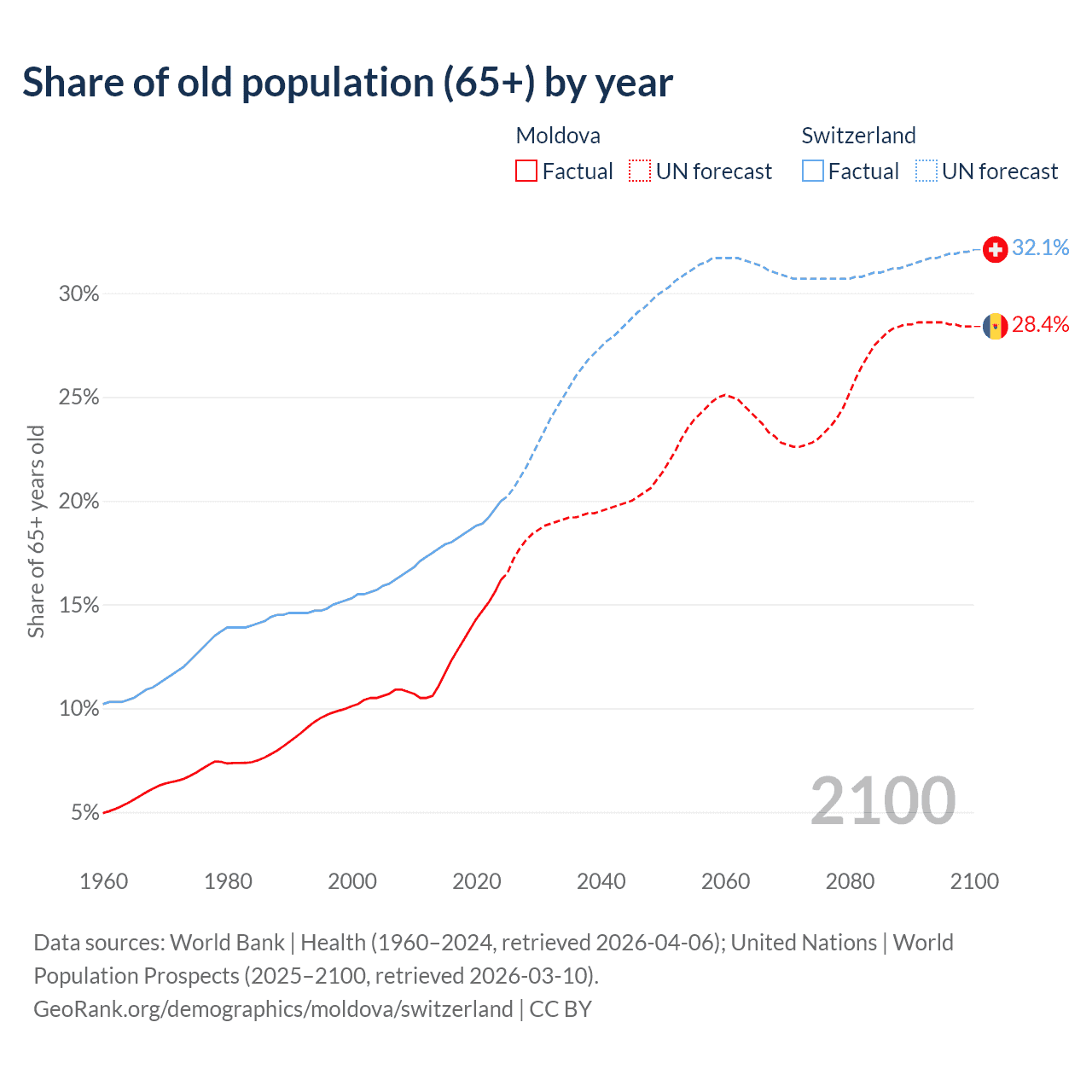 The share of older people aged 65 and over is 16.2% in Moldova and 20% in Switzerland. Life expectancy in Moldova compared to Switzerland .
