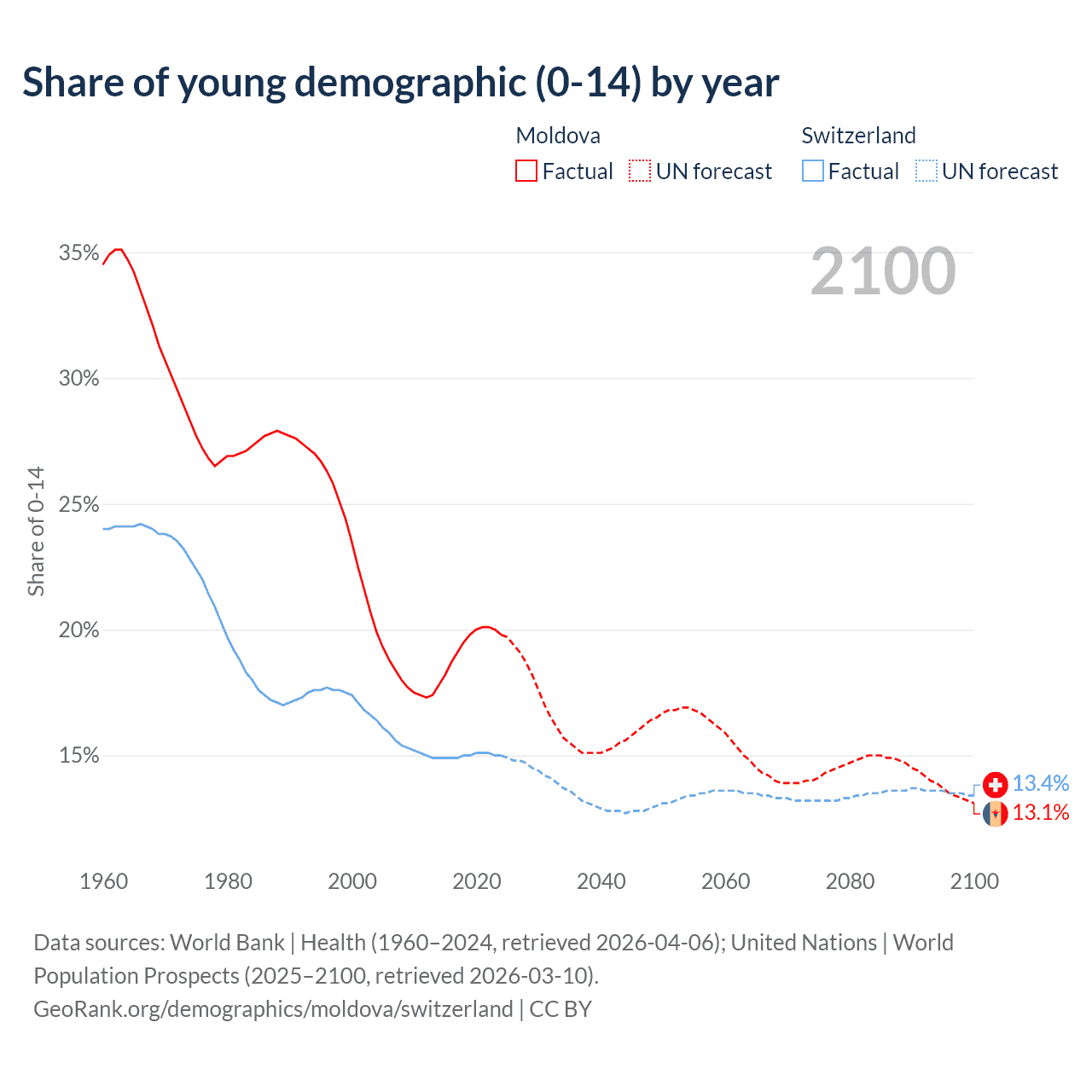 - The share of young demographic (0-15 years old) in Moldova is 19.8% vs 15% in Switzerland.