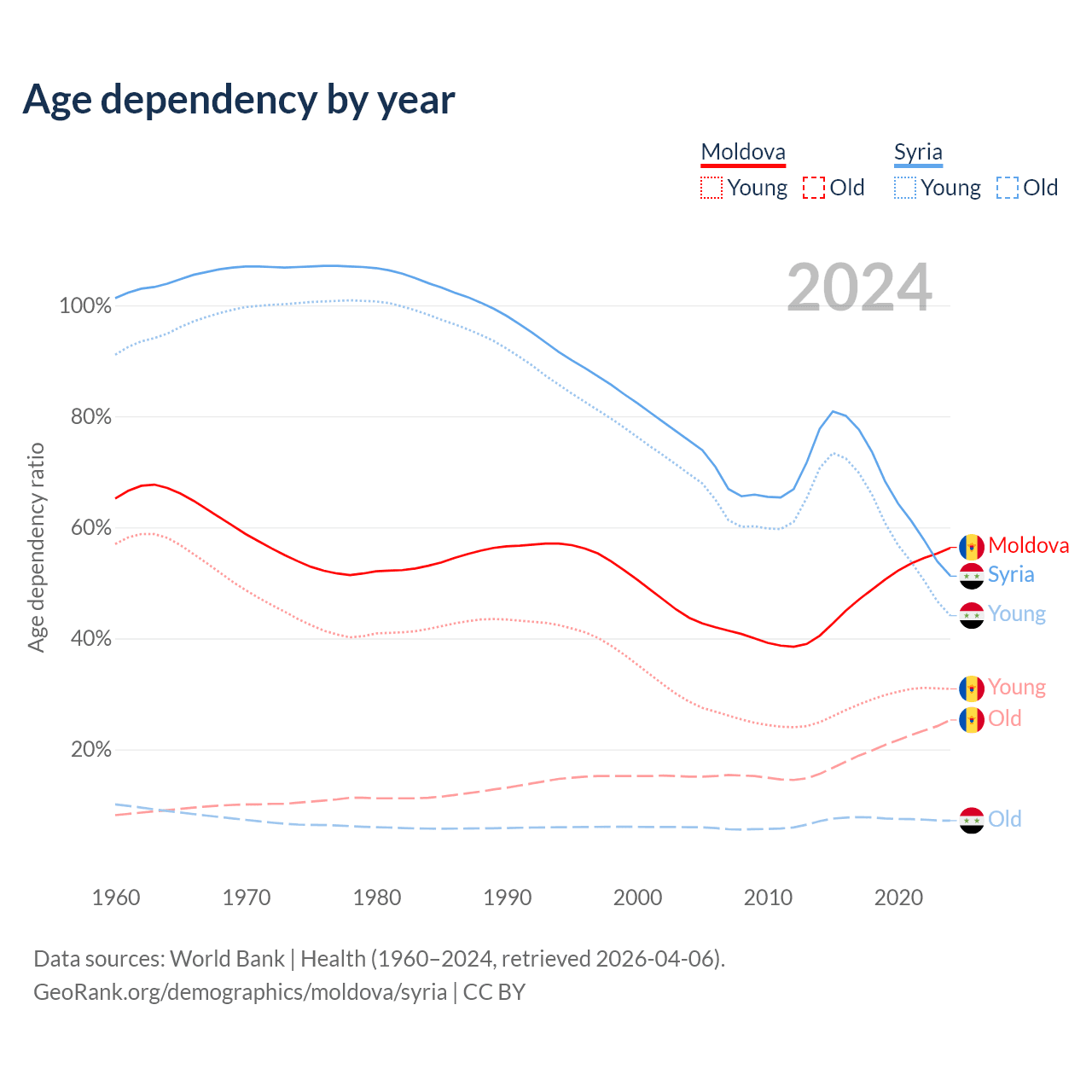 - The share of old-age demographic (65+) in Moldova is 16.2% vs 4.74% in Syria.