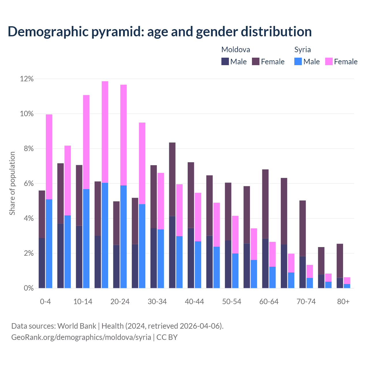 - As of 2026, the population of Moldova is 2.34M vs 26.8M in Syria - 11.5 times difference.