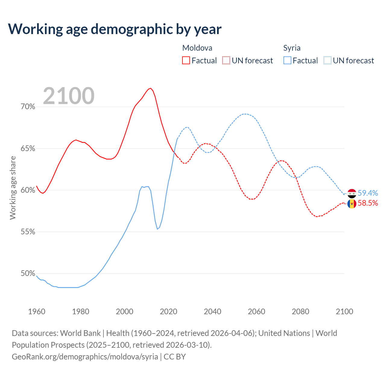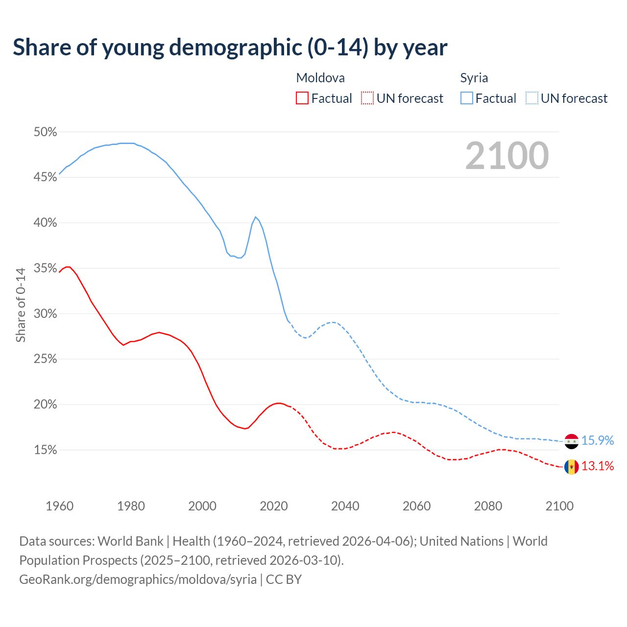 - The share of young demographic (0-15 years old) in Moldova is 19.8% vs 29.2% in Syria.