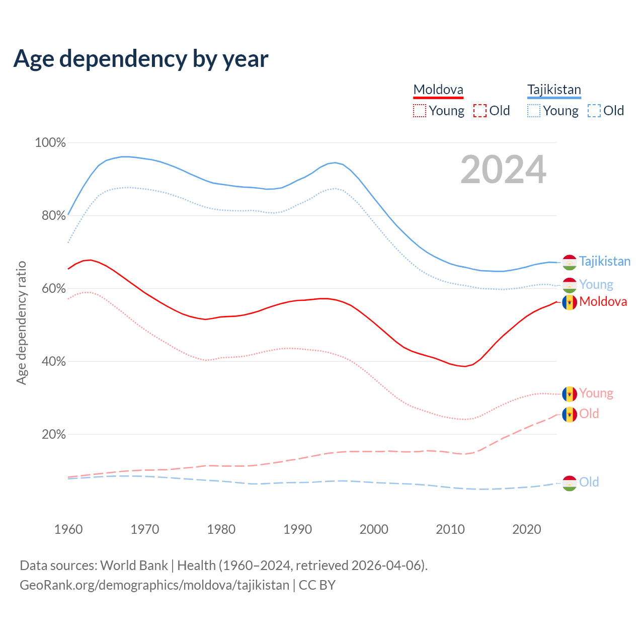 - The share of old-age demographic (65+) in Moldova is 16.2% vs 3.85% in Tajikistan.