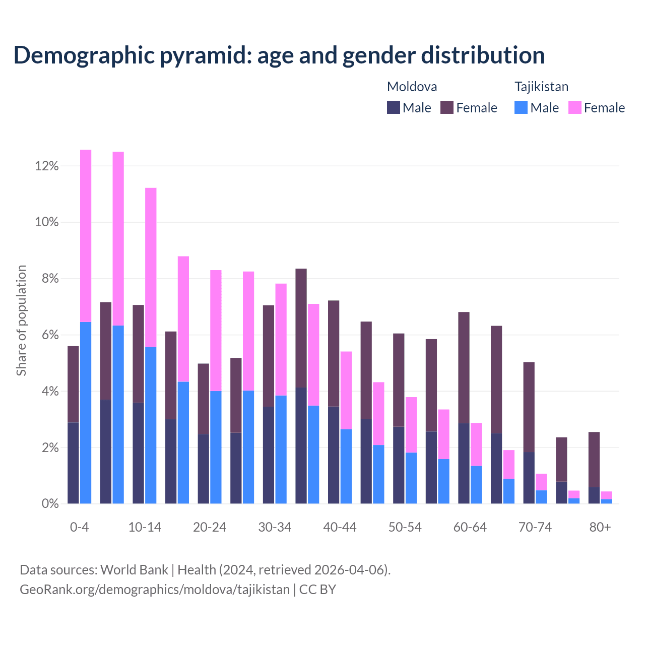 The share of older people aged 65 and over is 16.2% in Moldova and 3.85% in Tajikistan. Life expectancy in Moldova compared to Tajikistan .