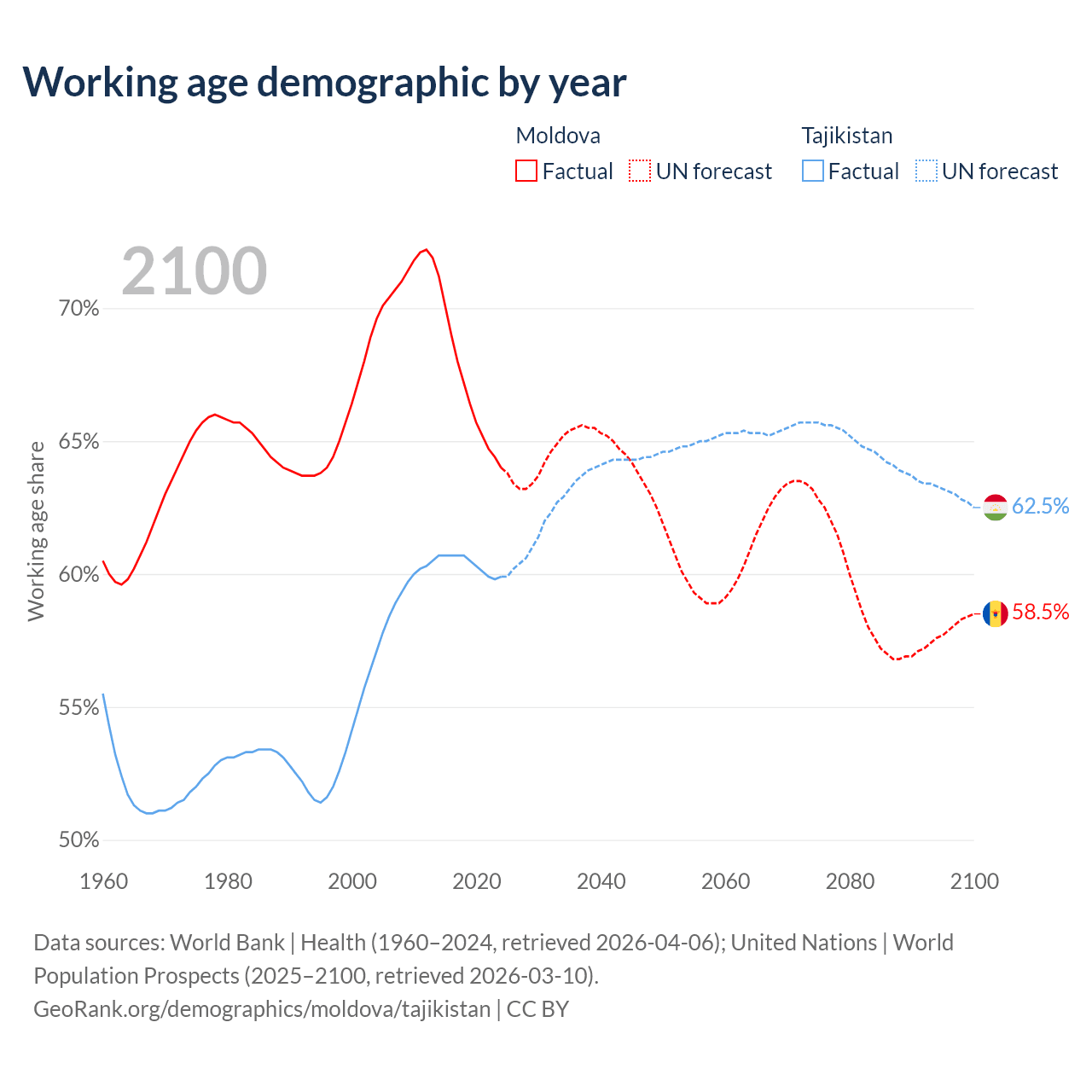 Median age Moldova vs Tajikistan, 1960-2100