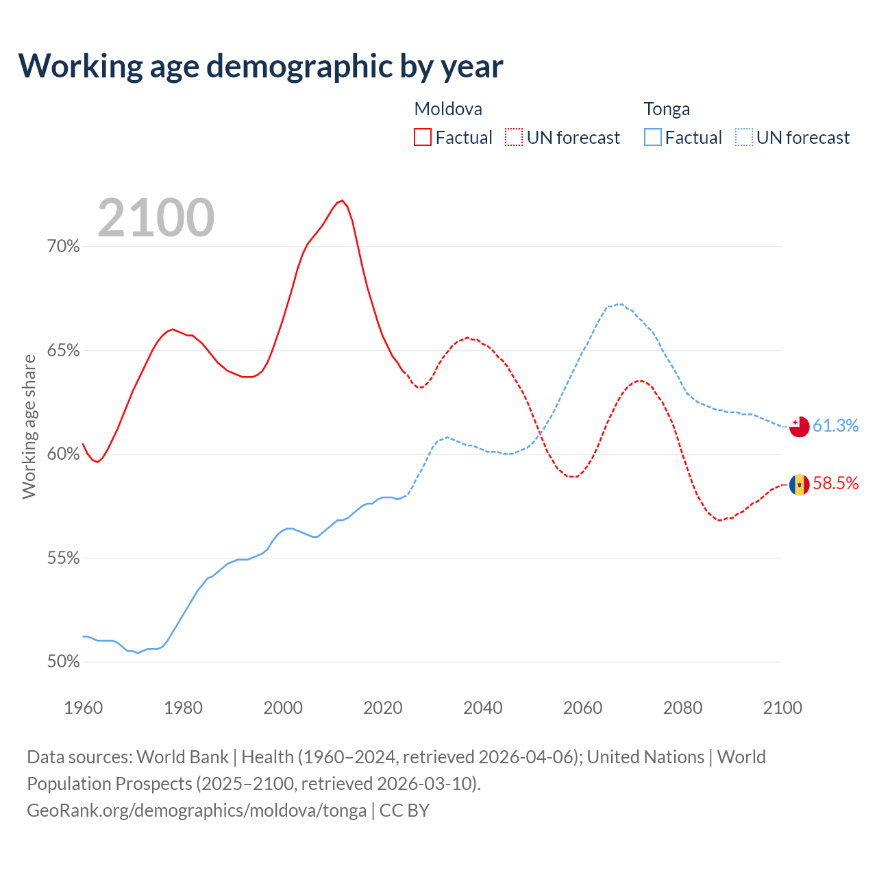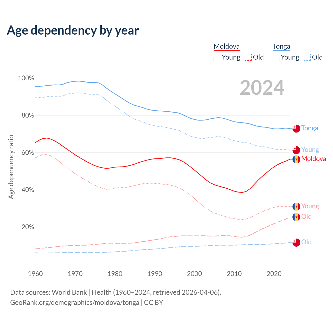 - The share of young demographic (0-15 years old) in Moldova is 19.8% vs 35.4% in Tonga.