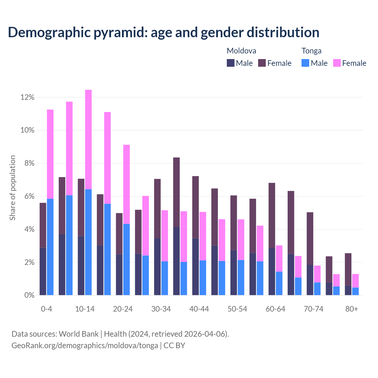 - As of 2026, the population of Moldova is 2.34M vs 103K in Tonga - 22.7 times difference.